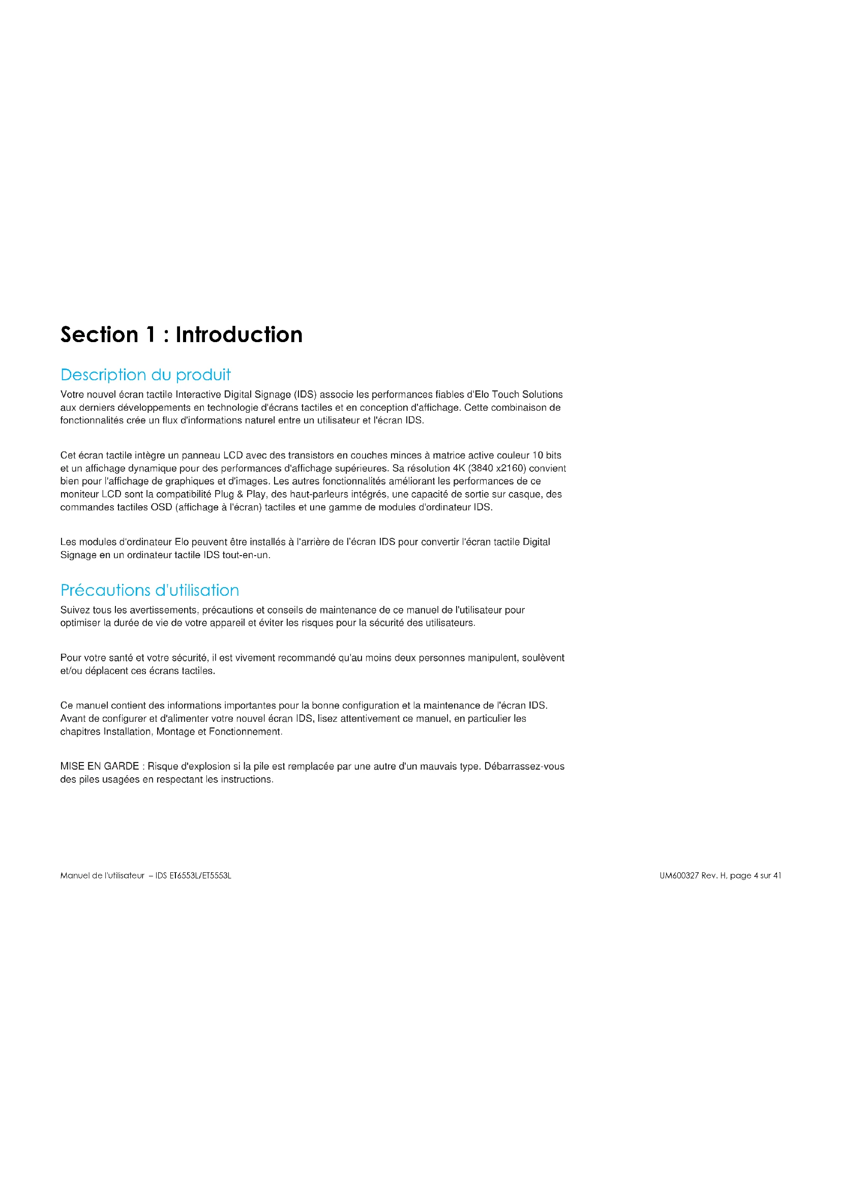 Ce manuel contient des informations importantes pour la bonne configuration et la maintenance de l'écran IDS. Avant de configurer et d'alimenter votre nouvel écran IDS, lisez attentivement ce manuel, en particulier les chapitres Installation, Montage et Fonctionnement.