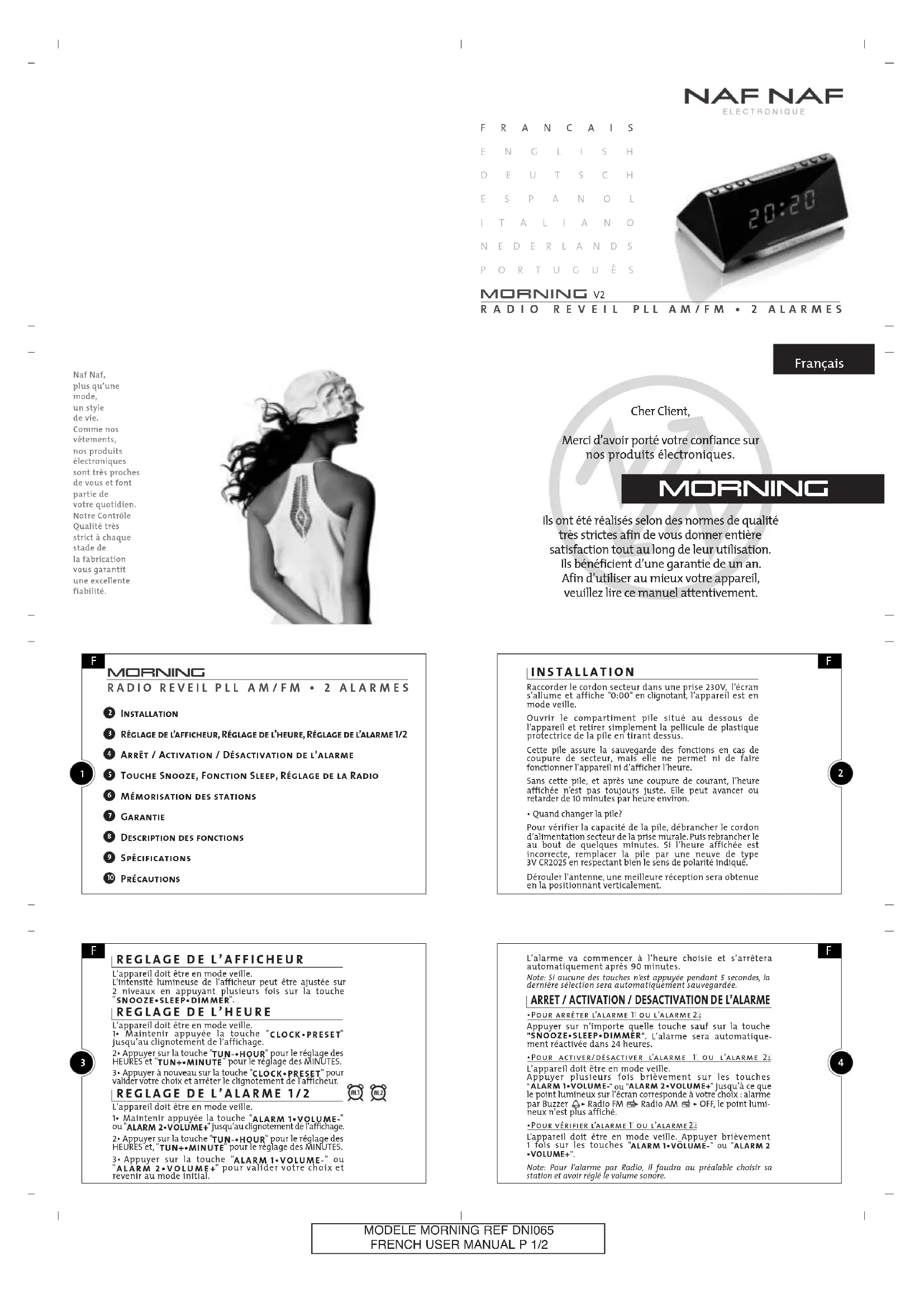 pour écouter la station désirée. Pour une recherche automati- que des stations, maintenir brièvement ces touches appuyées. Pour une recherche rapide, maintenir ces touches appuyées et relâcher sur la fréquence désirée. La fréquence va s’afficher pendant quelques secondes puis revenir en mode horloge. Modèle Morning V2 référence DNI065 Radio Réveil PLL à 2 gammes d'ondes - 20 mémoires Gamme de fréquences : FM 87.5 - 108,0 Mhz AM 522 - 1620 Khz Puissance de sortie : 400 mW 2 alarmes : radio, buzzer Fonction sleep Touche snooze Sauvegarde des fonctions par pile 3v Affichage LED orange réglable Alimentation : 220V AC - 50 Hz Alimentation sauvegarde : Pile 3 volts (CR2025) Dimensions : 150 x 55 x 78 mm Poids : 400 grammes (sans pile) Marque et modèle déposés XZZ2014, les dessins et spécifications peuvent être modifiés sans préavis. TT OO UU CC HH EE SS NN OO OO ZZ EE FF OO NN CC TT II OO NN SS LL EE EE PP MM EE MM OO RR II SS AA TT II OO NN DD EE SS SS TT AA TT II OO NN SS Vous pouvez mémoriser jusqu’à 10 stations par bandes. 1• En mode Radio, maintenir appuyée la touche "