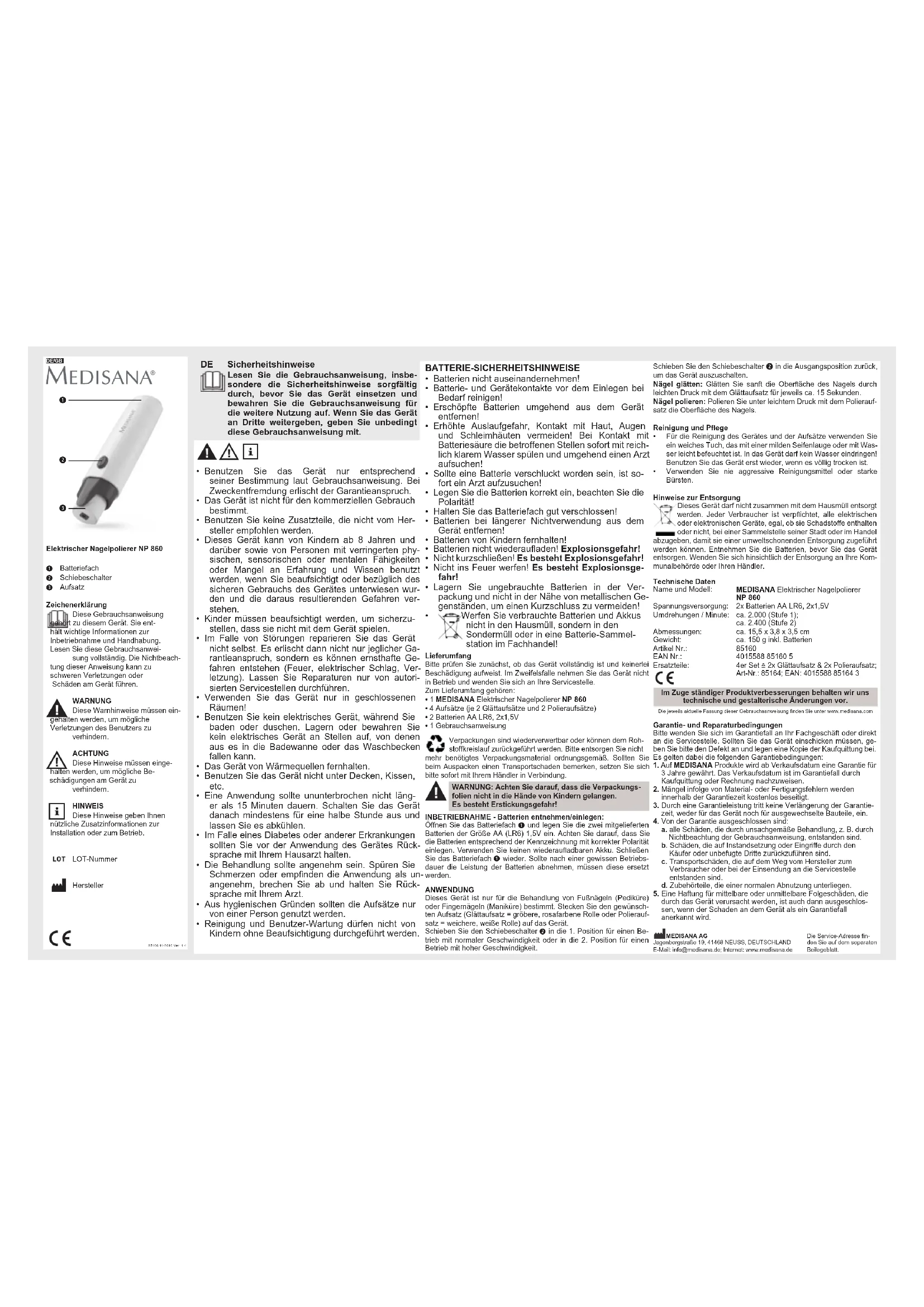 - N’utilisez jamais de détergents agressifs ni de brosses dures. Cet appareil ne doit pas être placé avec les ordures ménagères. Chaque consommateur doit ramener les appareils électriques ou électroniques, qu’ils contiennent des substances nocives ou non, à un point de collecte de sa commune ou dans le com- merce an de permettre leur élimination écologique. Retirez la pile avant de jeter l’appareil. Ne mettez pas les piles usagées à la poubelle, placez-les avec les déchets spéciaux ou déposez-les dans un point de collecte des piles usagées dans les commerces spécialisés. Pour plus de renseignements sur l’élimination des déchets, veuillez vous adresser aux services de votre commune ou bien à votre revendeur. Élimination de l’appareil Nom et modèle : Alimentation électrique : Tours / minute : Dimensions : Poids : N° d’article : N° EAN : Pièces de rechange : MEDISANA Polissoir à ongles électrique NP 860 2x piles AA LR6, 2x1,5V environ 2 000 (niveau 1); environ 2 400 (niveau 2) environ 15,5 x 3,8 x 3,5 cm environ 150 g (piles inclus)