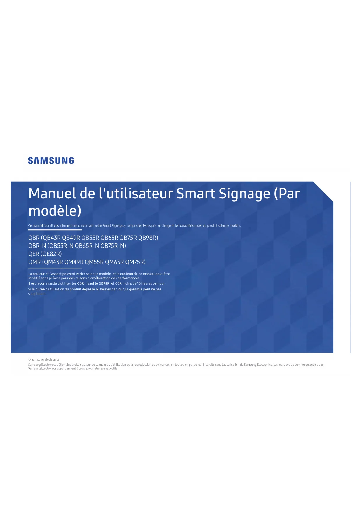 © Samsung Electronics Samsung Electronics détient les droits d'auteur de ce manuel. L'utilisation ou la reproduction de ce manuel, en tout ou en partie, est interdite sans l'autorisation de Samsung Electronics. Les marques de commerce autres que Samsung Electronics appartiennent à leurs propriétaires respectifs. QBR (QB43R QB49R QB55R QB65R QB75R QB98R) QBR-N (QB55R-N QB65R-N QB75R-N) QER (QE82R) QMR (QM43R QM49R QM55R QM65R QM75R) La couleur et l'aspect peuvent varier selon le modèle, et le contenu de ce manuel peut être modié sans préavis pour des raisons d'amélioration des performances. Il est recommandé d'utiliser les QBR* (sauf le QB98R) et QER moins de 16 heures par jour. Si la durée d'utilisation du produit dépasse 16heures par jour, la garantie peut ne pas s'appliquer. Manuel de l'utilisateur Smart Signage (Par modèle) Ce manuel fournit des informations concernant votre Smart Signage, y compris les types pris en charge et les caractéristiques du produit selon le modèle.Table des matières Préparation Vérification des composants 3 Pièces 4 Q*43R/Q*49R/Q*55R*/Q*65R*/Q*75R*/ QE82R 4 QB98R 5 Dispositif antivol 6 Connecteurs 7 Q*43R/Q*49R/Q*55R*/Q*65R*/Q*75R*/ QE82R 7 QB98R 8 Menu de commande 9 Précautions lors de la manipulation de l'écran 10 Avant d'installer l'appareil (guide d'installation) 11 Angle d'inclinaison et rotation 11 Ventilation 11 Installation du support mural 12 Préparation préalable à l'installation du support mural 12 Installation du support mural 12 Spécifications du nécessaire de support mural (VESA) 13 Spécifications Général 14 Modes de minutage préréglés 16 Annexe Licence 17