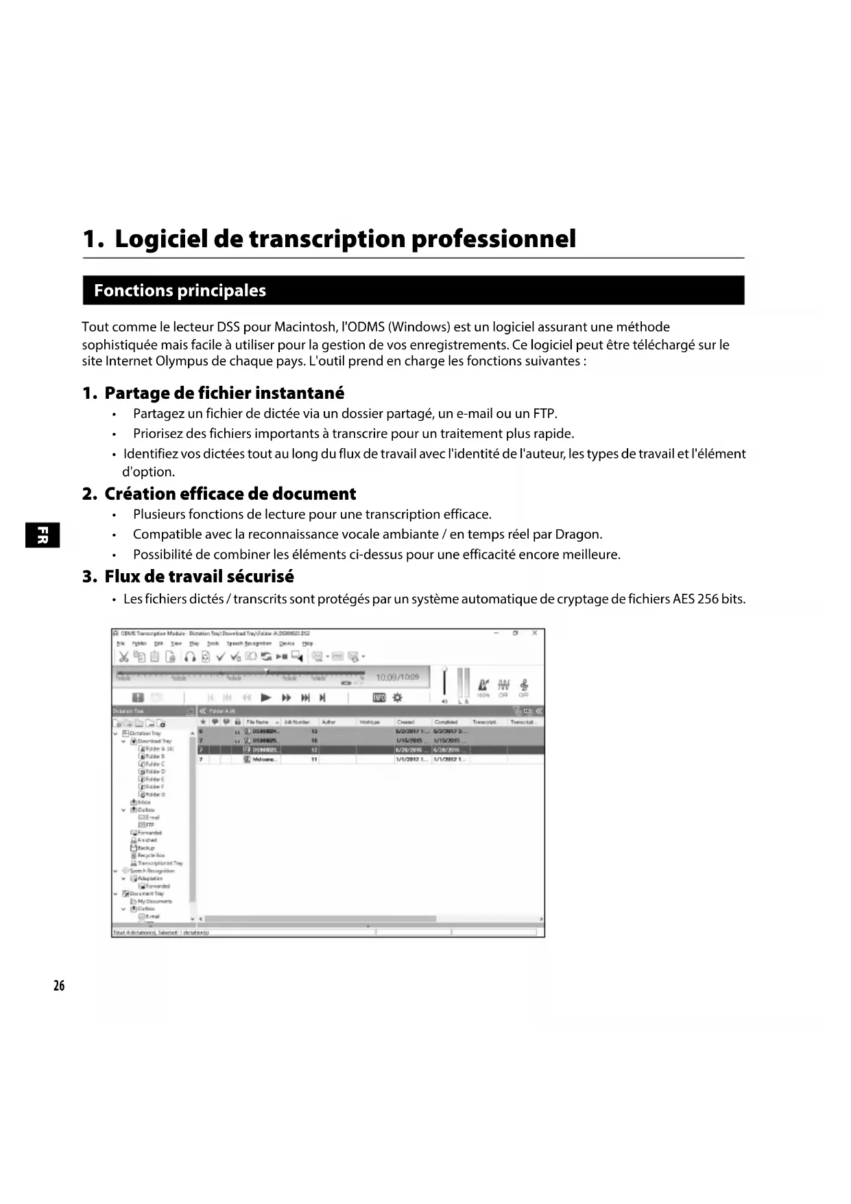 Fonctions principales Tout comme le lecteur DSS pour Macintosh, l'ODMS (Windows) est un logiciel assurant une méthode sophistiquée mais facile à utiliser pour la gestion de vos enregistrements. Ce logiciel peut être téléchargé sur le site Internet Olympus de chaque pays. L'outil prend en charge les fonctions suivantes: