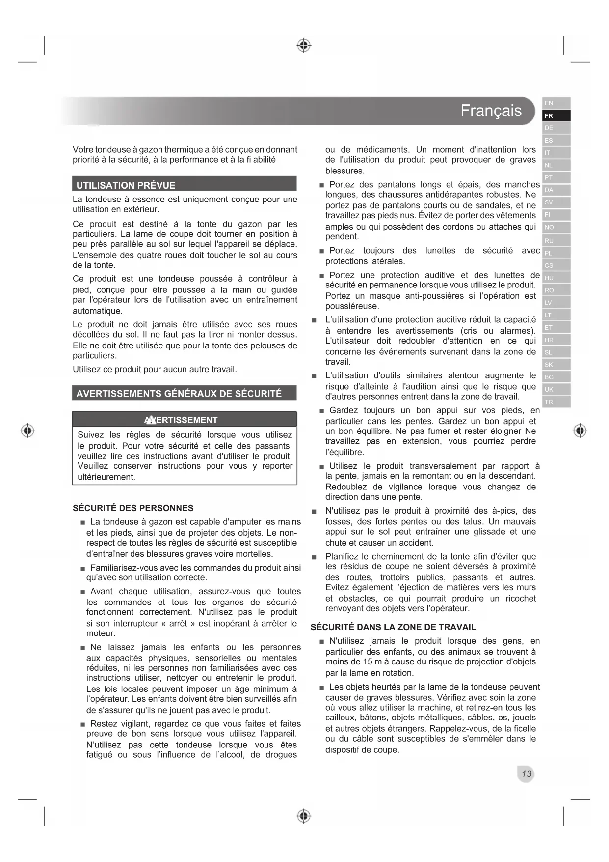 ■ La tondeuse à gazon est capable d'amputer les mains et les pieds, ainsi que de projeter des objets. Le non- respect de toutes les règles de sécurité est susceptible d’entraîner des blessures graves voire mortelles. ■ Familiarisez-vous avec les commandes du produit ainsi qu’avec son utilisation correcte. ■ Avant chaque utilisation, assurez-vous que toutes les commandes et tous les organes de sécurité fonctionnent correctement. N'utilisez pas le produit si son interrupteur « arrêt » est inopérant à arrêter le moteur. ■ Ne laissez jamais les enfants ou les personnes aux capacités physiques, sensorielles ou mentales réduites, ni les personnes non familiarisées avec ces instructions utiliser, nettoyer ou entretenir le produit. Les lois locales peuvent imposer un âge minimum à l’opérateur. Les enfants doivent être bien surveillés afin de s'assurer qu'ils ne jouent pas avec le produit. ■ Restez vigilant, regardez ce que vous faites et faites preuve de bon sens lorsque vous utilisez l'appareil. N’utilisez pas cette tondeuse lorsque vous êtes fatigué ou sous l’influence de l’alcool, de drogues ou de médicaments. Un moment d'inattention lors de l'utilisation du produit peut provoquer de graves blessures. ■ Portez des pantalons longs et épais, des manches longues, des chaussures antidérapantes robustes. Ne portez pas de pantalons courts ou de sandales, et ne travaillez pas pieds nus. Évitez de porter des vêtements amples ou qui possèdent des cordons ou attaches qui pendent. ■ Portez toujours des lunettes de sécurité avec protections latérales. ■ Portez une protection auditive et des lunettes de sécurité en permanence lorsque vous utilisez le produit. Portez un masque anti-poussières si l’opération est poussiéreuse. ■ L'utilisation d'une protection auditive réduit la capacité à entendre les avertissements (cris ou alarmes). L'utilisateur doit redoubler d'attention en ce qui concerne les événements survenant dans la zone de travail. ■ L'utilisation d'outils similaires alentour augmente le risque d'atteinte à l'audition ainsi que le risque que d'autres personnes entrent dans la zone de travail. ■ Gardez toujours un bon appui sur vos pieds, en particulier dans les pentes. Gardez un bon appui et un bon équilibre. Ne pas fumer et rester éloigner Ne travaillez pas en extension, vous pourriez perdre l’équilibre. ■ Utilisez le produit transversalement par rapport à la pente, jamais en la remontant ou en la descendant. Redoublez de vigilance lorsque vous changez de direction dans une pente. ■ N'utilisez pas le produit à proximité des à-pics, des fossés, des fortes pentes ou des talus. Un mauvais appui sur le sol peut entraîner une glissade et une chute et causer un accident. ■ Planifiez le cheminement de la tonte afin d'éviter que les résidus de coupe ne soient déversés à proximité des routes, trottoirs publics, passants et autres. Evitez également l’éjection de matières vers les murs et obstacles, ce qui pourrait produire un ricochet renvoyant des objets vers l’opérateur. SÉCURITÉ DANS LA ZONE DE TRAVAIL ■ N'utilisez jamais le produit lorsque des gens, en particulier des enfants, ou des animaux se trouvent à moins de 15 m à cause du risque de projection d'objets par la lame en rotation. ■ Les objets heurtés par la lame de la tondeuse peuvent causer de graves blessures. Vérifiez avec soin la zone où vous allez utiliser la machine, et retirez-en tous les cailloux, bâtons, objets métalliques, câbles, os, jouets et autres objets étrangers. Rappelez-vous, de la ficelle ou du câble sont susceptibles de s'emmêler dans le dispositif de coupe.Français