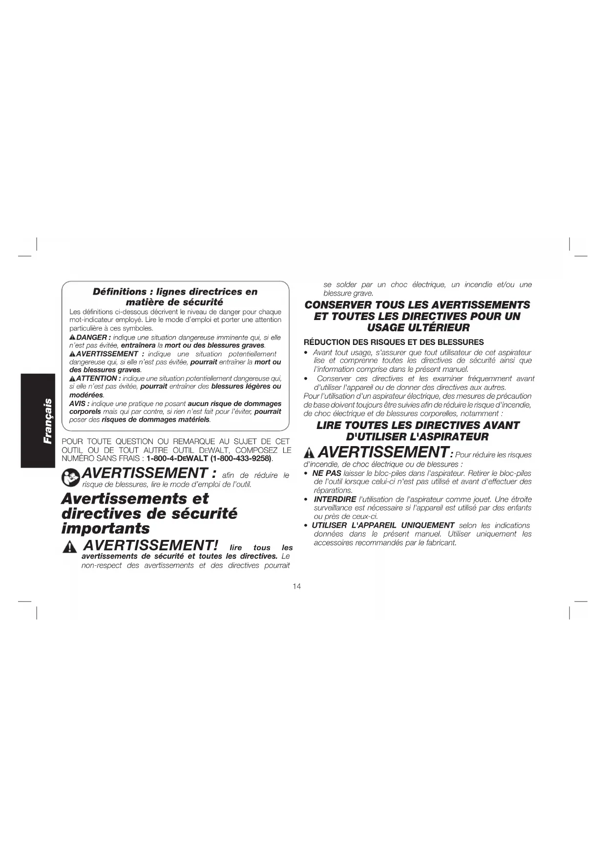 - Ne cherchez pas à réparer l’aspirateur. Pour assurer votre sécurité et la fiabilité du produit, toute réparation, maintenance, et tout réglage devraient être effectués par un centre de réparation DEWALT agréé.