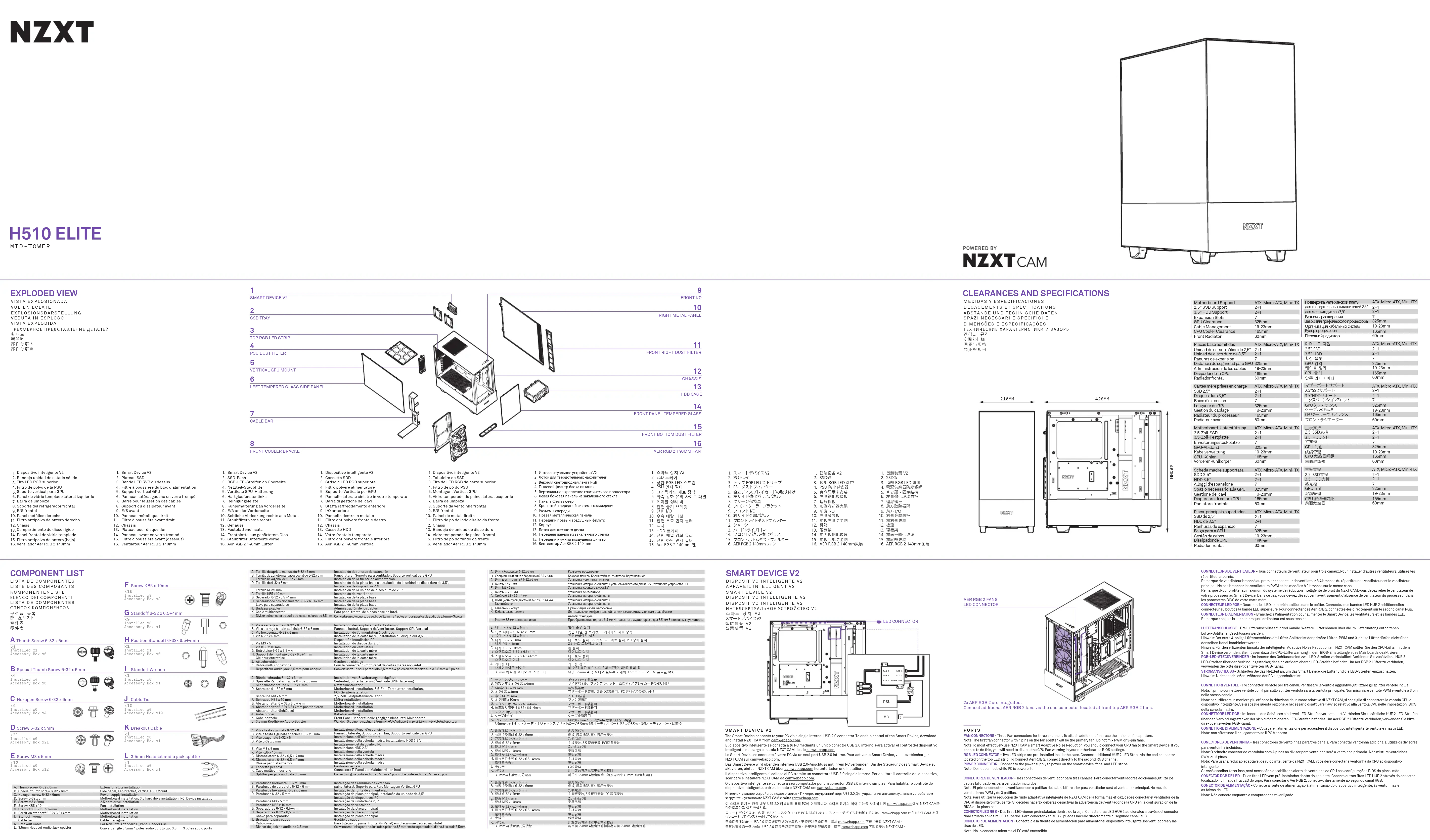 PORTS Motherboard-Unterstützung 2,5-Zoll-SSD 3,5-Zoll-Festplatte Erweiterungssteckplätze GPU-Abstand Kabelverwaltung CPU-Kühler Vorderer Kühlkörper Scheda madre supportata SDD 2.5” HDD 3.5” Alloggi d’espansione Spazio necessario alla GPU Gestione dei cavi Dispersore di calore CPU Radiatore frontale 210MM 428MM 460MM Smart Device V2 Plateau SSD Bande LED RVB du dessus Filtre à poussière du bloc d'alimentation Support vertical GPU Panneau latéral gauche en verre trempé Barre pour la gestion des câbles Support du dissipateur avant E/S avant Panneau métallique droit Filtre à poussière avant droit Châssis Plateau pour disque dur Panneau avant en verre trempé Filtre à poussière avant (dessous) Ventilateur Aer RGB 2 140mm