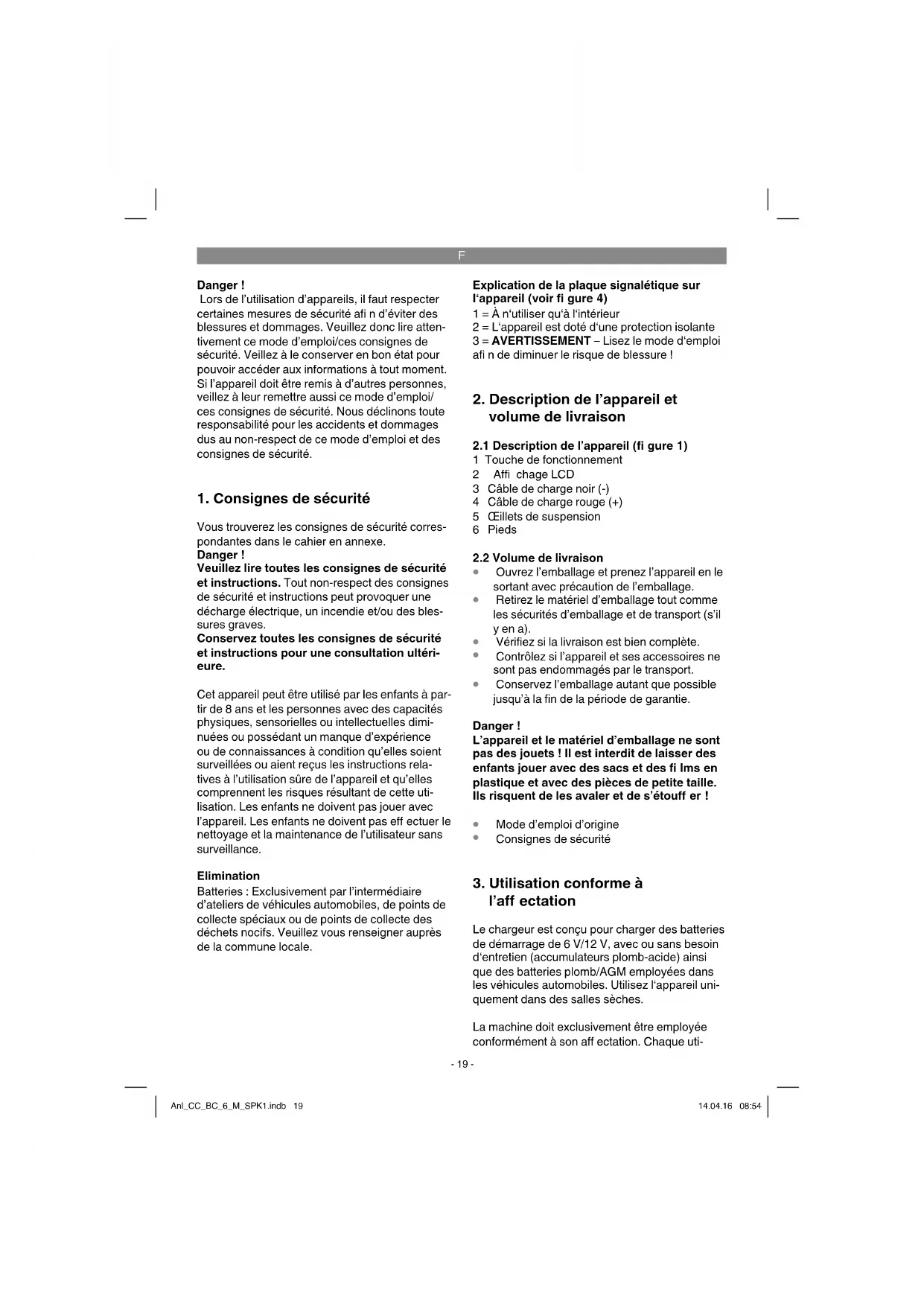 l’aff ectation Le chargeur est conçu pour charger des batteries de démarrage de 6 V/12 V, avec ou sans besoin d‘entretien (accumulateurs plomb-acide) ainsi que des batteries plomb/AGM employées dans les véhicules automobiles. Utilisez l‘appareil uni- quement dans des salles sèches. La machine doit exclusivement être employée conformément à son aff ectation. Chaque uti- Anl_CC_BC_6_M_SPK1.indb 19Anl_CC_BC_6_M_SPK1.indb 19 14.04.16 08:5414.04.16 08:54F