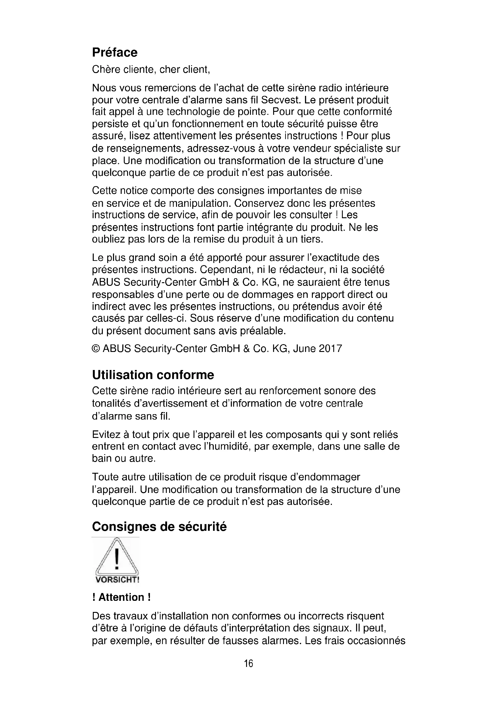 Préface Chère cliente, cher client, Nous vous remercions de l’achat de cette sirène radio intérieure pour votre centrale d’alarme sans fil Secvest. Le présent produit fait appel à une technologie de pointe. Pour que cette conformité persiste et qu’un fonctionnement en toute sécurité puisse être assuré, lisez attentivement les présentes instructions ! Pour plus de renseignements, adressez-vous à votre vendeur spécialiste sur place. Une modification ou transformation de la structure d’une quelconque partie de ce produit n’est pas autorisée. Cette notice comporte des consignes importantes de mise en service et de manipulation. Conservez donc les présentes instructions de service, afin de pouvoir les consulter ! Les présentes instructions font partie intégrante du produit. Ne les oubliez pas lors de la remise du produit à un tiers. Le plus grand soin a été apporté pour assurer l’exactitude des présentes instructions. Cependant, ni le rédacteur, ni la société ABUS Security-Center GmbH & Co. KG, ne sauraient être tenus responsables d’une perte ou de dommages en rapport direct ou indirect avec les présentes instructions, ou prétendus avoir été causés par celles-ci. Sous réserve d’une modification du contenu du présent document sans avis préalable. © ABUS Security-Center GmbH & Co. KG, June 2017 Utilisation conforme Cette sirène radio intérieure sert au renforcement sonore des tonalités d’avertissement et d’information de votre centrale d’alarme sans fil. Evitez à tout prix que l’appareil et les composants qui y sont reliés entrent en contact avec l’humidité, par exemple, dans une salle de bain ou autre. Toute autre utilisation de ce produit risque d’endommager l’appareil. Une modification ou transformation de la structure d’une quelconque partie de ce produit n’est pas autorisée. Consignes de sécurité ! Attention ! Des travaux d’installation non conformes ou incorrects risquent d’être à l’origine de défauts d’interprétation des signaux. Il peut, par exemple, en résulter de fausses alarmes. Les frais occasionnés17 par d’éventuelles interventions des pompiers ou de la police, par exemple, sont à la charge de l’utilisateur de la centrale d’alarme. L’appareil a été conçu pour être utilisé uniquement à l’intérieur. Tenez compte des instructions et des consignes de la présente notice ! Le non-respect des présentes instructions entraîne l’annulation de la garantie ! Tout autre utilisation de ce produit risque d’endommager l’appareil. Une modification ou une transformation de la partie électronique de ce produit n’est pas autorisée. Dans ce cas, la société ne saurait être tenue responsable des dommages indirects ! ! Avertissements concernant la batterie ! L’appareil est alimenté en tension continue par 3 monocellules de 1,5 V. Pour assurer une vie longue durée à la batterie et éviter les incendies et les préjudices corporels, veuillez tenir compte des consignes ci-après : Ne jetez pas la batterie dans les ordures ménagères. La batterie ne doit être ni directement exposée à une source de chaleur ou un rayonnement solaire ni conservée dans un lieu à très haute température. Ne faites pas brûler la batterie. La batterie ne doit pas entrer en contact avec de l’eau. Elle ne doit être ni démontée, ni percée, ni endommagée. Les contacts de la batterie ne doivent pas être court-circuités. Mettez la batterie hors de portée des enfants en bas-âge. La batterie n’est pas rechargeable. Installation La sirène doit être montée à plat sur le mur, à une hauteur appropriée à l’utilisateur. Veillez à ce qu’une alimentation appropriée au choix de 12 V ou par 3 monocellules D de 1,5 V ou les deux soit disponible. La sirène intérieure peut être montée jusqu’à une distance de 100 m par rapport à la centrale d’alarme sans fil. La portée de réception dépend fortement du contexte architectural du bâtiment. Contrôle du site L’intensité du signal entrant doit être mesurée au niveau de la position prévue pour la sirène radio. Pour cela, notre boîtier de test radio FU3801 peut être utilisé. Evitez les sites de montage suivants :18 A proximité de ou sur les grandes constructions métalliques. A moins de 1 mètre des fils électriques et des tuyaux métalliques, d’eau et de gaz. Dans les boîtiers en acier. A proximité d’équipements électroniques et notamment d’ordinateurs, de photocopieurs et d’appareils de communication. Pour monter l’embase au mur, desserrez la vis sous le boîtier et soulevez doucement la partie avant de l’embase. Vue interne