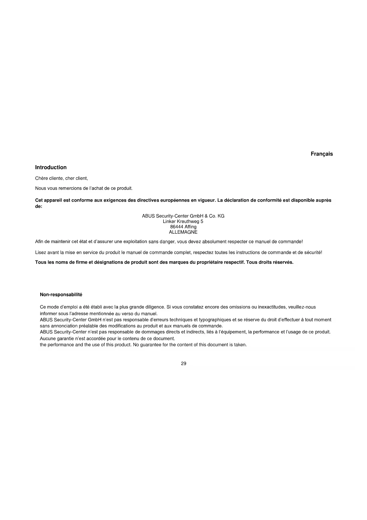 Notice d’utilisation29 Français Introduction Chère cliente, cher client, Nous vous remercions de l’achat de ce produit. Cet appareil est conforme aux exigences des directives européennes en vigueur. La déclaration de conformité est disponible auprès de: ABUS Security-Center GmbH & Co. KG Linker Kreuthweg 5 86444 Affing ALLEMAGNE Afin de maintenir cet état et d’assurer une exploitation sans danger, vous devez absolument respecter ce manuel de commande! Lisez avant la mise en service du produit le manuel de commande complet, respectez toutes les instructions de commande et de sécurité! Tous les noms de firme et désignations de produit sont des marques du propriétaire respectif. Tous droits réservés.