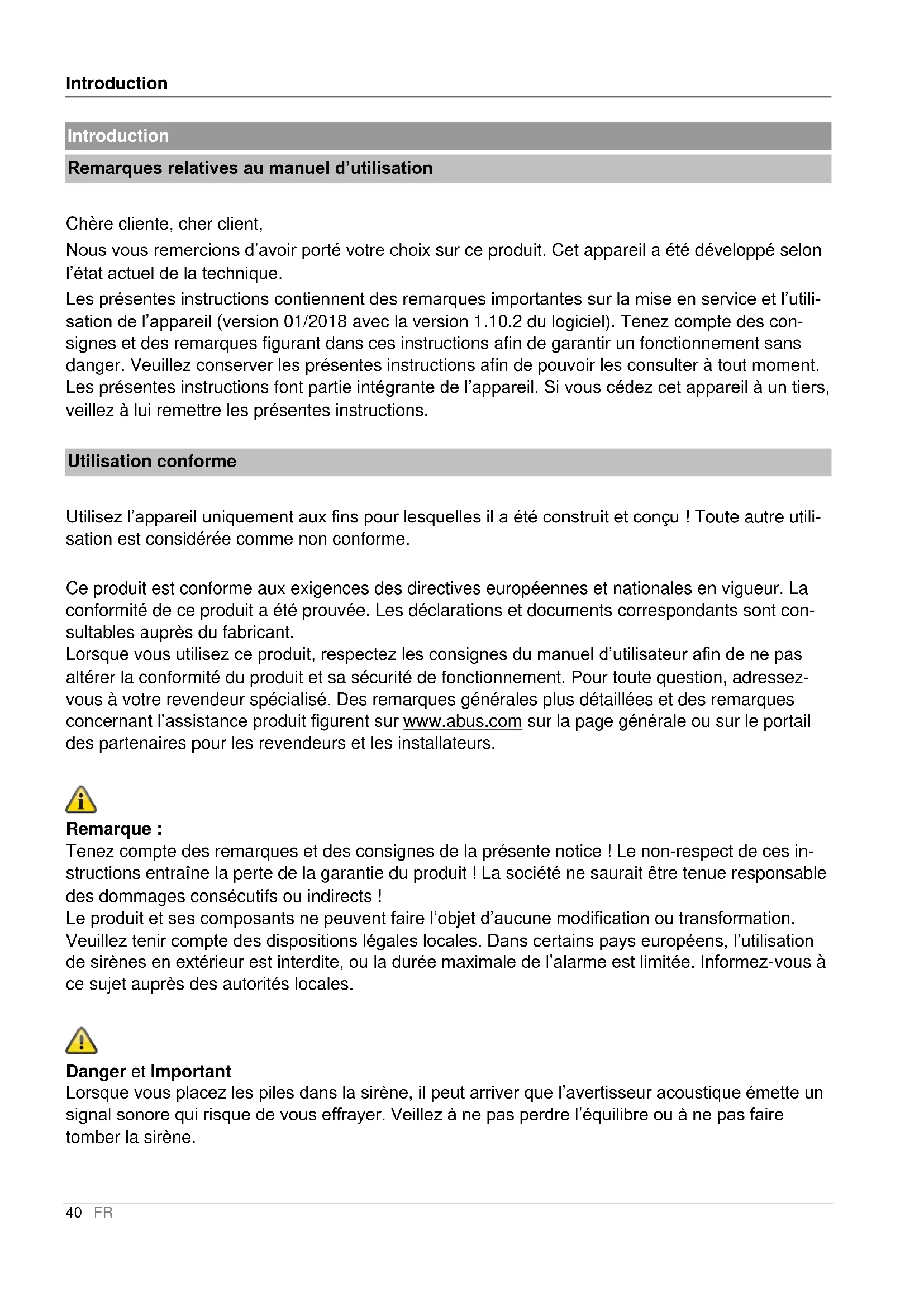40 | FR Introduction Remarques relatives au manuel d’utilisation Chère cliente, cher client, Nous vous remercions d’avoir porté votre choix sur ce produit. Cet appareil a été développé selon l’état actuel de la technique. Les présentes instructions contiennent des remarques importantes sur la mise en service et l’utili- sation de l’appareil (version 01/2018 avec la version 1.10.2 du logiciel). Tenez compte des con- signes et des remarques figurant dans ces instructions afin de garantir un fonctionnement sans danger. Veuillez conserver les présentes instructions afin de pouvoir les consulter à tout moment. Les présentes instructions font partie intégrante de l’appareil. Si vous cédez cet appareil à un tiers, veillez à lui remettre les présentes instructions. Utilisation conforme Utilisez l’appareil uniquement aux fins pour lesquelles il a été construit et conçu ! Toute autre utili- sation est considérée comme non conforme. Ce produit est conforme aux exigences des directives européennes et nationales en vigueur. La conformité de ce produit a été prouvée. Les déclarations et documents correspondants sont con- sultables auprès du fabricant. Lorsque vous utilisez ce produit, respectez les consignes du manuel d’utilisateur afin de ne pas altérer la conformité du produit et sa sécurité de fonctionnement. Pour toute question, adressez- vous à votre revendeur spécialisé. Des remarques générales plus détaillées et des remarques concernant l’assistance produit figurent sur www.abus.com sur la page générale ou sur le portail des partenaires pour les revendeurs et les installateurs.
