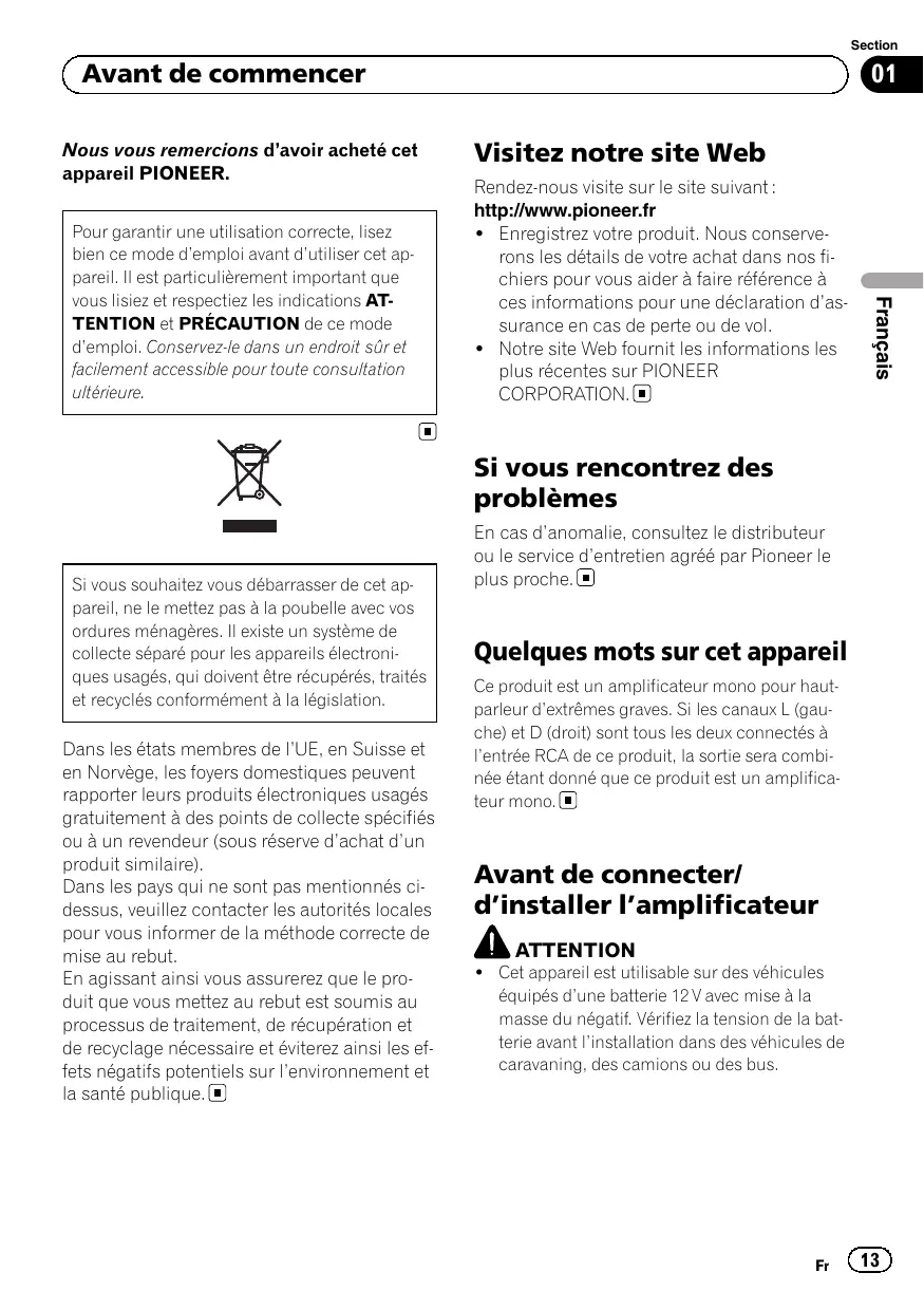 Si vous rencontrez des problèmes Si vous souhaitez vous débarrasser de cet appareil, ne le mettez pas à la poubelle avec vos ordures ménagères. Il existe un système de collecte séparé pour les appareils électroniques usagés, qui doivent être récupérés, traités et recyclés conformément à la législation. Dans les états membres de l’UE, en Suisse et en Norvège, les foyers domestiques peuvent rapporter leurs produits électroniques usagés gratuitement à des points de collecte spécifiés ou à un revendeur (sous réserve d’achat d’un produit similaire). Dans les pays qui ne sont pas mentionnés cidessus, veuillez contacter les autorités locales pour vous informer de la méthode correcte de mise au rebut. En agissant ainsi vous assurerez que le produit que vous mettez au rebut est soumis au processus de traitement, de récupération et de recyclage nécessaire et éviterez ainsi les effets négatifs potentiels sur l’environnement et la santé publique. En cas d’anomalie, consultez le distributeur ou le service d’entretien agréé par Pioneer le plus proche. Quelques mots sur cet appareil Ce produit est un amplificateur mono pour hautparleur d’extrêmes graves. Si les canaux L (gauche) et D (droit) sont tous les deux connectés à l’entrée RCA de ce produit, la sortie sera combinée étant donné que ce produit est un amplificateur mono. Avant de connecter/ d’installer l’amplificateur ATTENTION ! Cet appareil est utilisable sur des véhicules équipés d’une batterie 12 V avec mise à la masse du négatif. Vérifiez la tension de la batterie avant l’installation dans des véhicules de caravaning, des camions ou des bus.