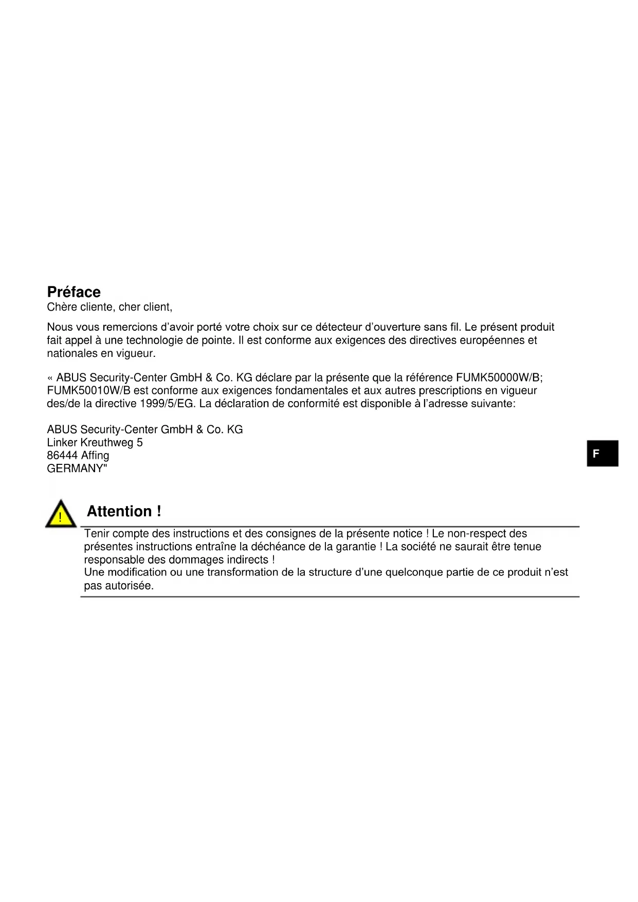 Préface Chère cliente, cher client, Nous vous remercions d’avoir porté votre choix sur ce détecteur d’ouverture sans fil. Le présent produit fait appel à une technologie de pointe. Il est conforme aux exigences des directives européennes et nationales en vigueur. « ABUS Security-Center GmbH & Co. KG déclare par la présente que la référence FUMK50000W/B; FUMK50010W/B est conforme aux exigences fondamentales et aux autres prescriptions en vigueur des/de la directive 1999/5/EG. La déclaration de conformité est disponible à l’adresse suivante: ABUS Security-Center GmbH & Co. KG Linker Kreuthweg 5 86444 Affing GERMANY"