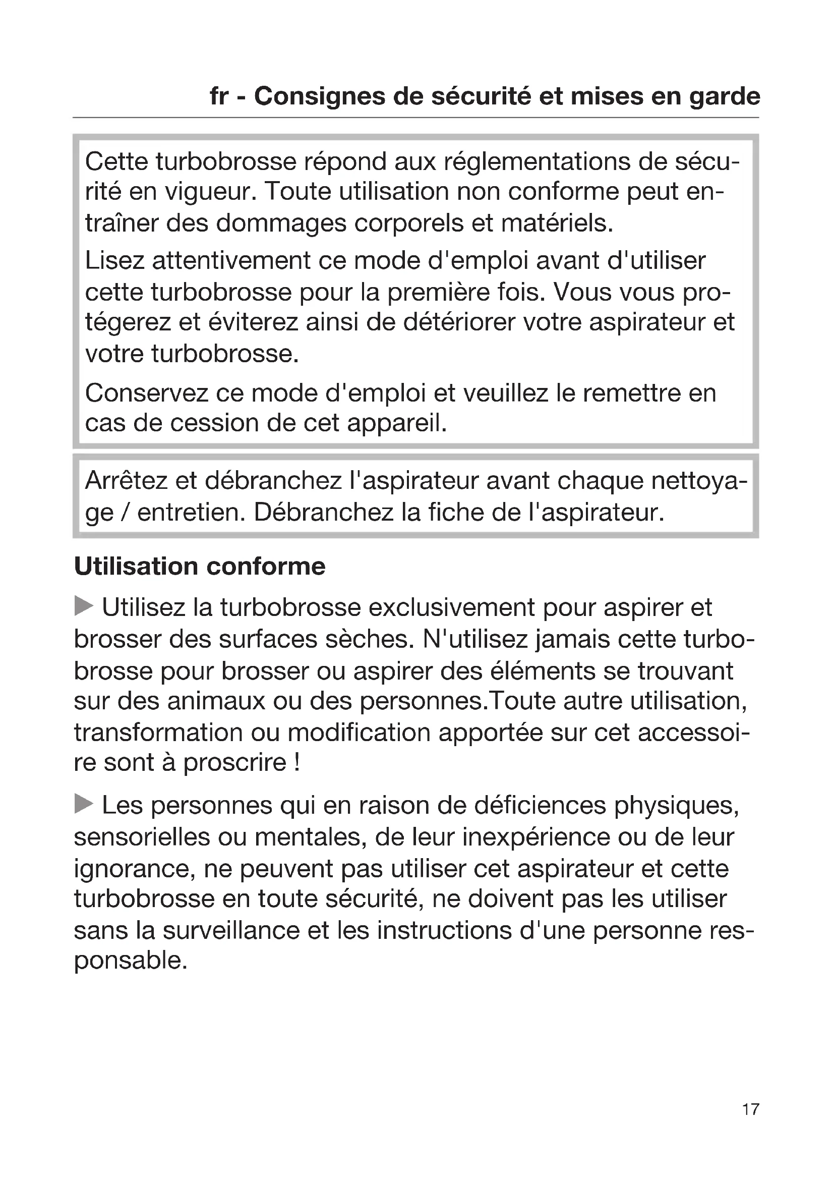 Cette turbobrosse répond aux réglementations de sécu‐ rité en vigueur. Toute utilisation non conforme peut en‐ traîner des dommages corporels et matériels. Lisez attentivement ce mode d'emploi avant d'utiliser cette turbobrosse pour la première fois. Vous vous pro‐ tégerez et éviterez ainsi de détériorer votre aspirateur et votre turbobrosse. Conservez ce mode d'emploi et veuillez le remettre en cas de cession de cet appareil. Arrêtez et débranchez l'aspirateur avant chaque nettoya‐ ge / entretien. Débranchez la fiche de l'aspirateur. Utilisation conforme Utilisez la turbobrosse exclusivement pour aspirer et brosser des surfaces sèches. N'utilisez jamais cette turbo‐ brosse pour brosser ou aspirer des éléments se trouvant sur des animaux ou des personnes.Toute autre utilisation, transformation ou modification apportée sur cet accessoi‐ re sont à proscrire ! Les personnes qui en raison de déficiences physiques, sensorielles ou mentales, de leur inexpérience ou de leur ignorance, ne peuvent pas utiliser cet aspirateur et cette turbobrosse en toute sécurité, ne doivent pas les utiliser sans la surveillance et les instructions d'une personne res‐ ponsable.fr - Consignes de sécurité et mises en garde