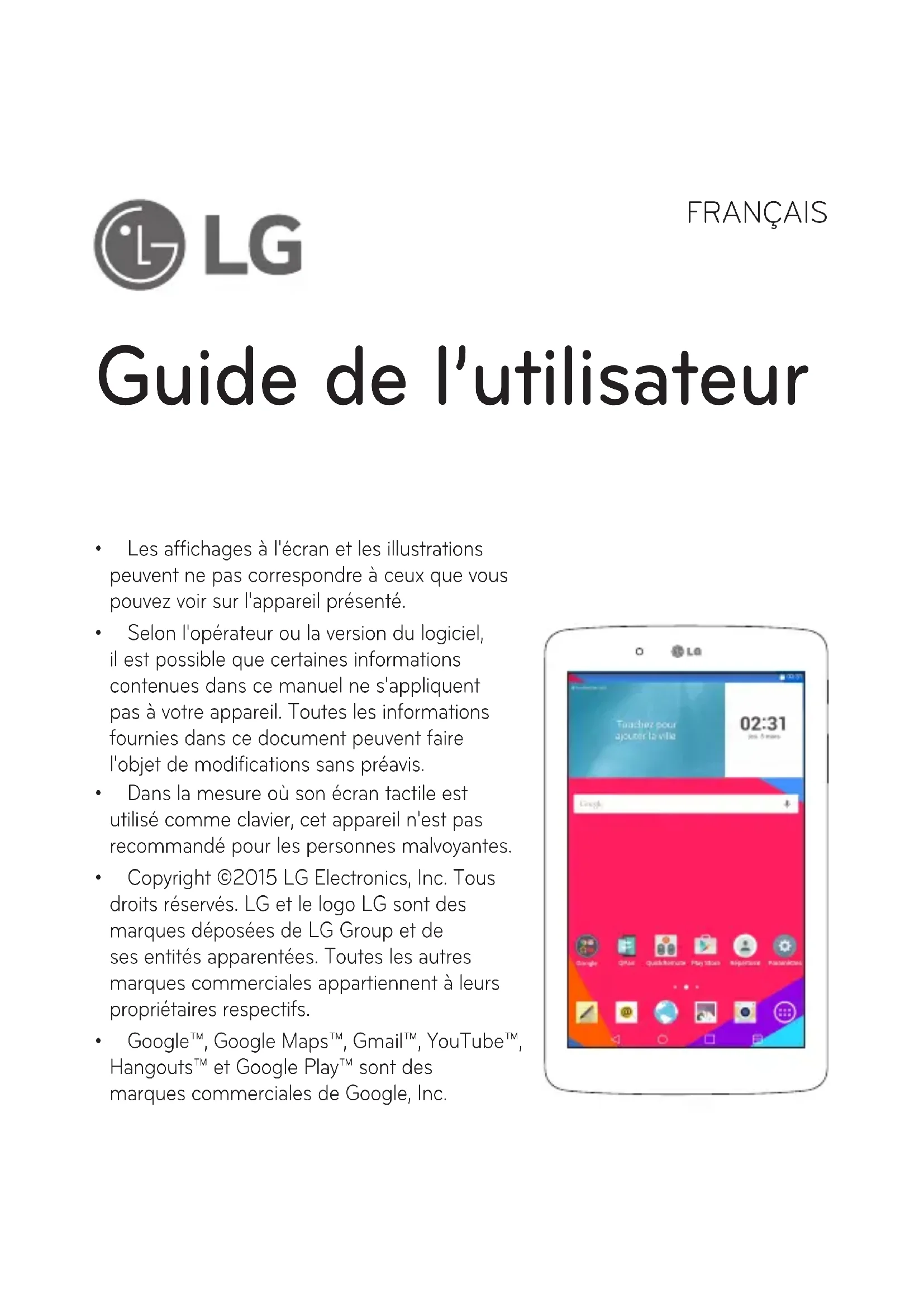 - Dans la mesure où son écran tactile est utilisé comme clavier, cet appareil n'est pas recommandé pour les personnes malvoyantes. Copyright ©2015 LG Electronics, Inc. Tous droits réservés. LG et le logo LG sont des marques déposées de LG Group et de ses entités apparentées. Toutes les autres marques commerciales appartiennent à leurs propriétaires respectifs.