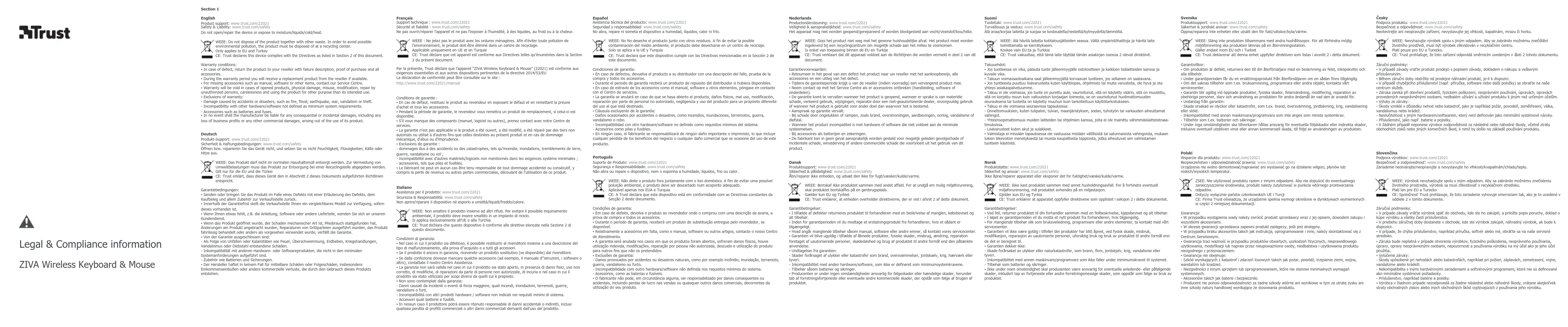 - Producenten er under ingen omstændigheder ansvarlig for følgeskader eller hændelige skader, herunder tab af forretningsfortjeneste eller eventuelle andre kommercielle skader, der opstår som følge af brugen af produktet. Français Support technique : www.trust.com/22021 Sécurité et fiabilité : www.trust.com/safety Ne pas ouvrir/réparer l’appareil et ne pas l’exposer à l’humidité, à des liquides, au froid ou à la chaleur. WEEE : Ne jetez pas le produit avec les ordures ménagères. Afin d'éviter toute pollution de l'environnement, le produit doit être éliminé dans un centre de recyclage. Applicable uniquement en UE et en Turquie CE: Trust déclare que cet appareil est conforme aux Directives telles qu’énumérées dans la Section 2 du présent document. Conditions de garantie :