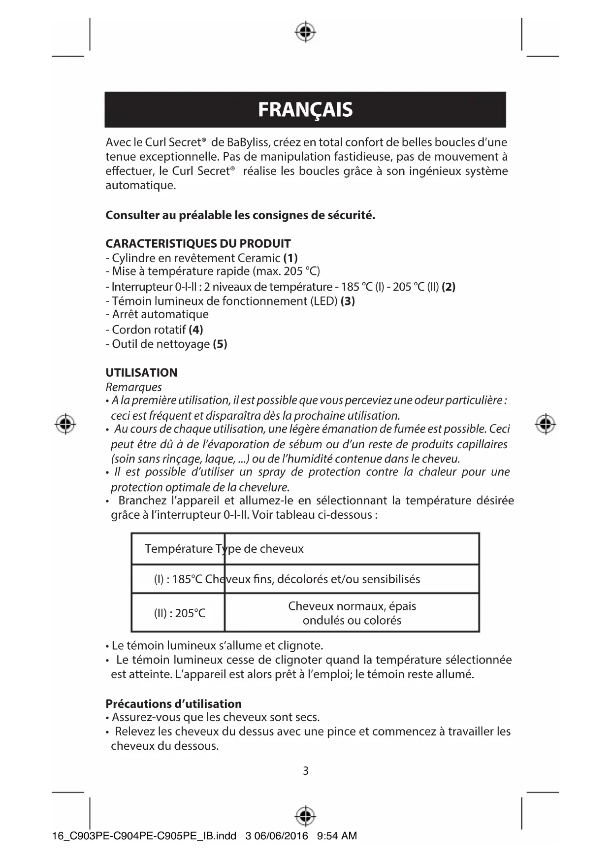 16_C903PE-C904PE-C905PE_IB.indd 2 06/06/2016 9:54 AM3 Avec le Curl Secret® de BaByliss, créez en total confort de belles boucles d’une tenue exceptionnelle. Pas de manipulation fastidieuse, pas de mouvement à eectuer, le Curl Secret® réalise les boucles grâce à son ingénieux système automatique. Consulter au préalable les consignes de sécurité.