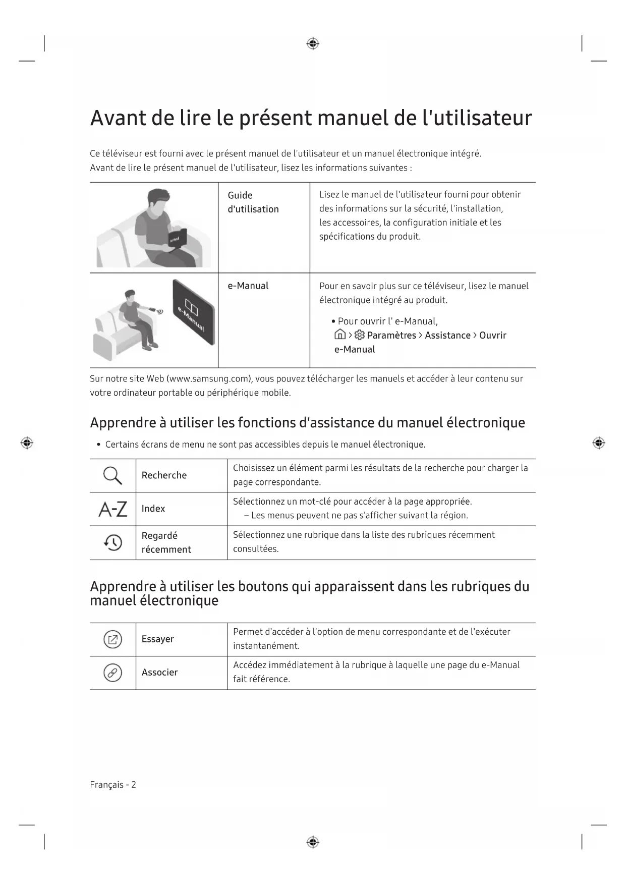 - Pour ouvrir l' e-Manual, > Paramètres > Assistance > Ouvrir e-Manual Sur notre site Web (www.samsung.com), vous pouvez télécharger les manuels et accéder à leur contenu sur votre ordinateur portable ou périphérique mobile. Apprendre à utiliser les fonctions d'assistance du manuel électronique