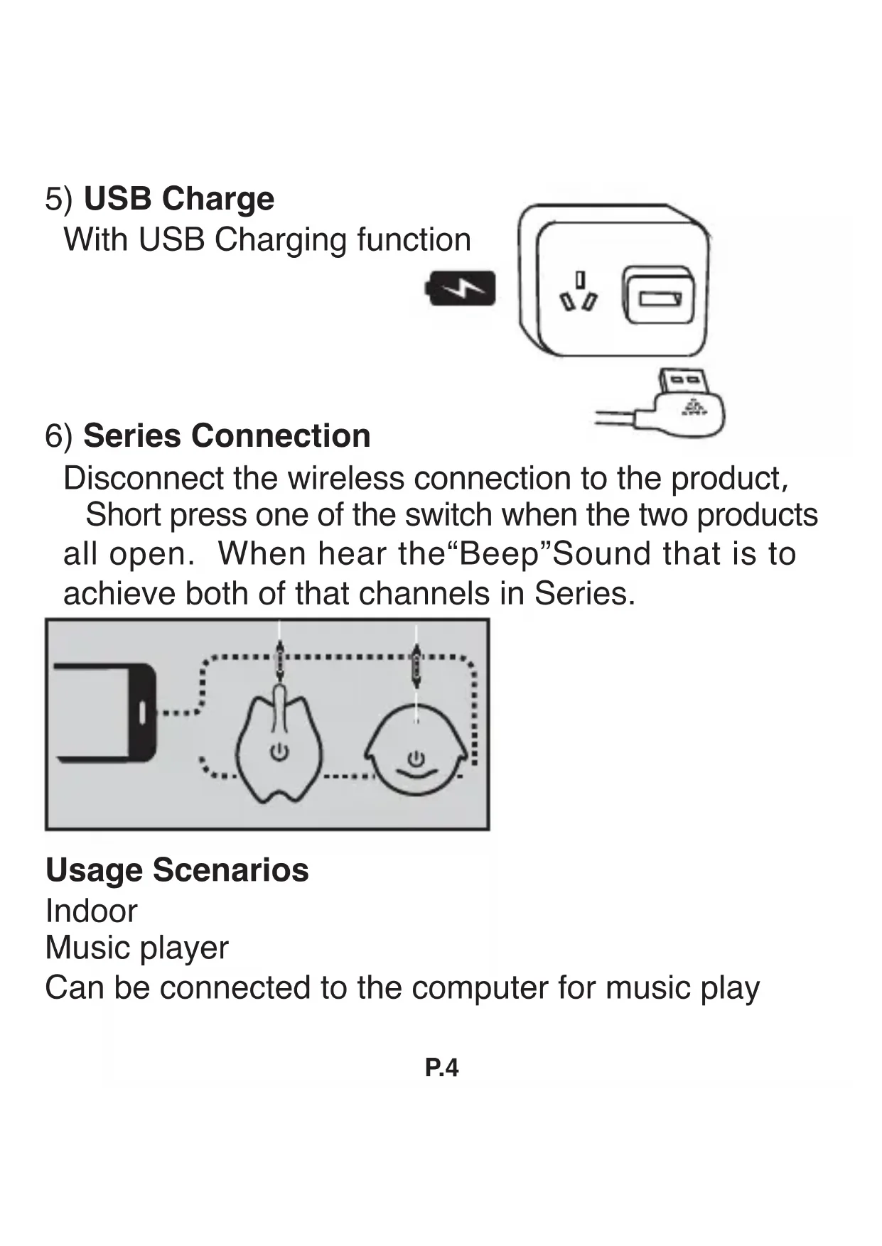 Déconnectez le sans fil du produit, appuyez sur l’un des boutons lorsque les deux appareils sont allumés. Lorsque vous entendez un « Bip », cela indique que les deux canaux sont connectés en série.