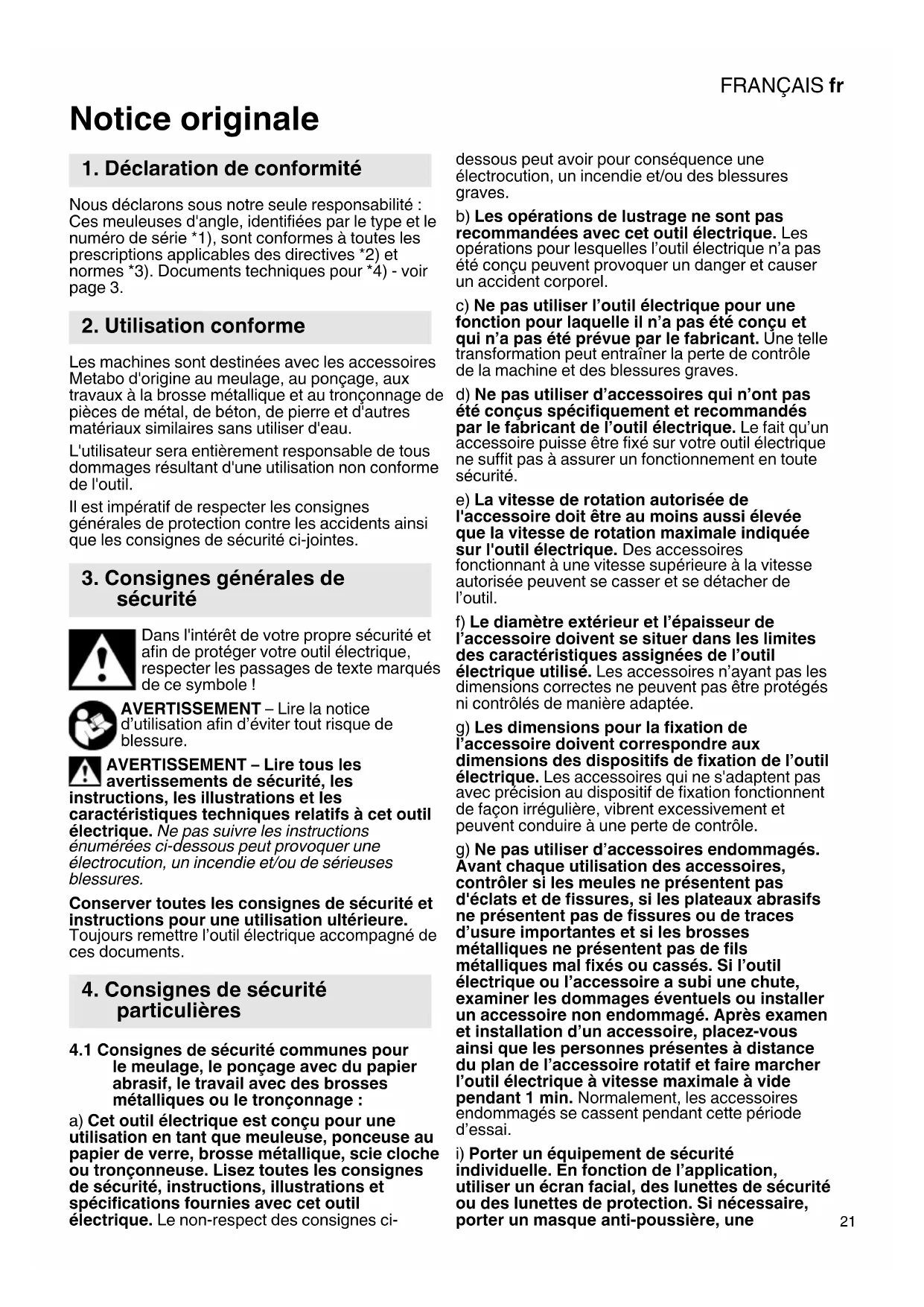Notice originale Nous déclarons sous notre seule responsabilité : Ces meuleuses d'angle, identifiées par le type et le numéro de série *1), sont conformes à toutes les prescriptions applicables des directives *2) et normes *3). Documents techniques pour *4) - voir page 3. Les machines sont destinées avec les accessoires Metabo d'origine au meulage, au ponçage, aux travaux à la brosse métallique et au tronçonnage de pièces de métal, de béton, de pierre et d'autres matériaux similaires sans utiliser d'eau. L'utilisateur sera entièrement responsable de tous dommages résultant d'une utilisation non conforme de l'outil. Il est impératif de respecter les consignes générales de protection contre les accidents ainsi que les consignes de sécurité ci-jointes. Dans l'intérêt de votre propre sécurité et afin de protéger votre outil électrique, respecter les passages de texte marqués de ce symbole ! AVERTISSEMENT – Lire la notice d’utilisation afin d’éviter tout risque de blessure. AVERTISSEMENT – Lire tous les avertissements de sécurité, les instructions, les illustrations et les caractéristiques techniques relatifs à cet outil électrique. Ne pas suivre les instructions énumérées ci-dessous peut provoquer une électrocution, un incendie et/ou de sérieuses blessures. Conserver toutes les consignes de sécurité et instructions pour une utilisation ultérieure. Toujours remettre l’outil électrique accompagné de ces documents.