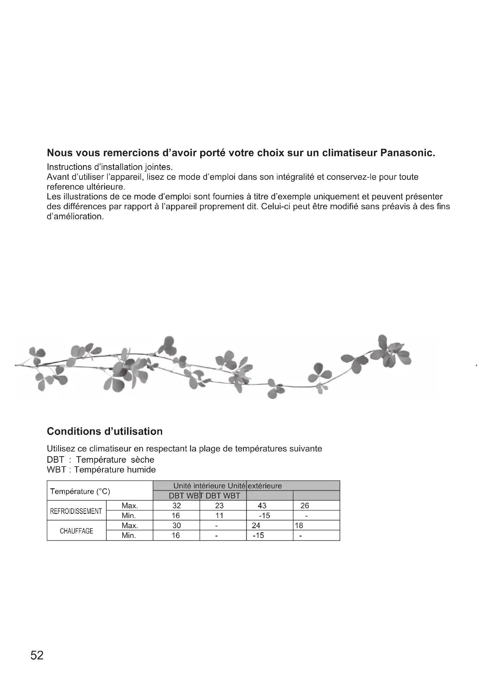 ΕλληνικαΑντιμετωπιση προβληματων / Πληροφοριες52 Conditions d’utilisation Utilisez ce climatiseur en respectant la plage de températures suivante DBT : Température sèche WBT : Température humide Température (°C) Unité intérieure Unité extérieure