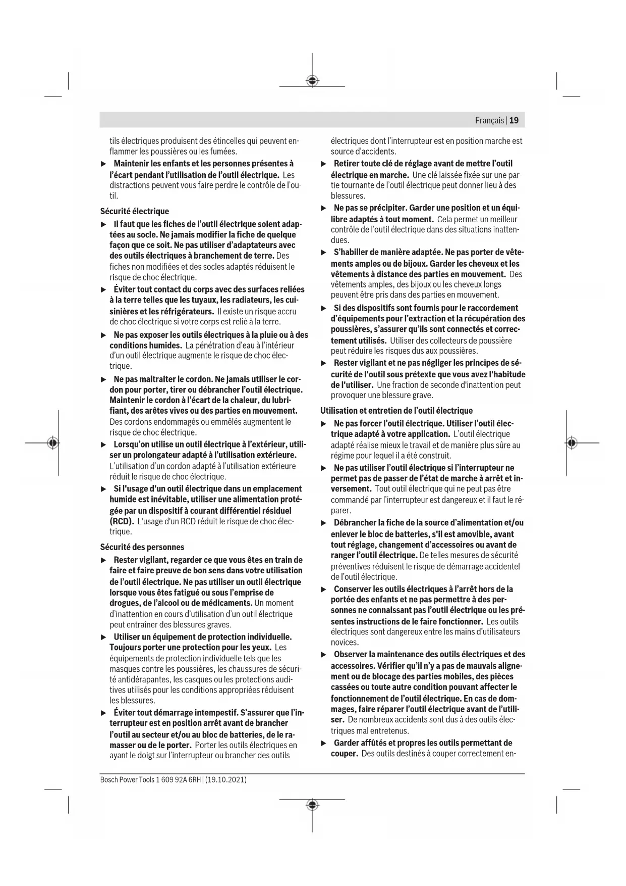 The vibration level and noise emission value given in these instructions have been measured in accordance with a standardised measuring procedure and may be used to com- pare power tools. They may also be used for a preliminary estimation of vibration and noise emissions. The stated vibration level and noise emission value repres- ent the main applications of the power tool. However, if the power tool is used for other applications, with different ap- plication tools or is poorly maintained, the vibration level and noise emission value may differ. This may significantly increase the vibration and noise emissions over the total working period. To estimate vibration and noise emissions accurately, the times when the tool is switched off or when it is running but not actually being used should also be taken into account. This may significantly reduce vibration and noise emissions over the total working period. Implement additional safety measures to protect the oper- ator from the effects of vibration, such as servicing the power tool and application tools, keeping their hands warm, and organising workflows correctly. Assembly u Remove the battery from the power tool before carry- ing out work on the power tool (e.g. maintenance, changing tool, etc.). The battery should also be re- moved for transport and storage. There is risk of injury from unintentionally pressing the on/off switch. Charging the Battery u Use only the chargers listed in the technical data. Only these chargers are matched to the lithium-ion battery of your power tool. Note: The battery is supplied partially charged. To ensure full battery capacity, fully charge the battery in the charger before using your power tool for the first time. The lithium-ion battery can be charged at any time without reducing its service life. Interrupting the charging process does not damage the battery. The lithium-ion battery is protected against deep discharge by the "Electronic Cell Protection (ECP)". When the battery is discharged, the power tool is switched off by means of a protective circuit: The application tool no longer rotates. u Do not continue to press the On/Off switch after the power tool has automatically switched off. The battery can be damaged. Removing the battery To remove the battery , press the battery release button and pull the battery to the rear and out of the power tool. Do not use force to do this. Battery charge indicator When the on/off switch (11) is pressed in halfway or com- pletely, the battery charge-control indicator (9) indicates the charge condition of the battery for several seconds. The indicator consists of three green LEDs. LED Capacity Continuous lighting 3x green 75–100 % Continuous lighting 2x green 40–75% Continuous lighting 1x green 15–40% Slowly flashing light 1 x green 0–15 % The three LEDs in the battery charge indicator flash quickly when the temperature of the battery is outside the operating temperature range of –30 to +65 °C and/or the overload protection has been triggered. Changing the tool (see figure A) u The application tool may heat up significantly during operation. Allow it to cool down before touching it. The drill spindle is locked when the on/off switch (11) is not pressed. This makes it possible to change the application tool in the drill chuck quickly, conveniently and easily. Open the keyless chuck (2) by turning it in the direction of rotation ➊ until the tool can be inserted. Insert the tool. Firmly tighten the keyless chuck (2) by turning it by hand in the direction of rotation ➋. This will automatically lock the drill chuck. 1 609 92A 6RH | (19.10.2021) Bosch Power ToolsEnglish | 17 Dust/Chip Extraction Dust from materials such as lead-containing coatings, some wood types, minerals and metal can be harmful to one’s health. Touching or breathing-in the dust can cause allergic reactions and/or lead to respiratory infections of the user or bystanders. Certain dust, such as oak or beech dust, is considered carci- nogenic, especially in connection with wood-treatment ad- ditives (chromate, wood preservative). Materials containing asbestos may only be worked by specialists. – Provide for good ventilation of the working place. – It is recommended to wear a P2 filter-class respirator. Observe the relevant regulations in your country for the ma- terials to be worked. u Avoid dust accumulation at the workplace. Dust can easily ignite. Operation Starting Operation Inserting the battery Note: The use of batteries unsuitable for your power tool can lead to malfunctions or damage to the power tool. Set the rotational direction switch (10) to the middle posi- tion to avoid unintentionally switching it on. Insert the charged battery (7) into the handle until you feel it engage and it is flush with the handle. Setting the rotational direction (see figureB) The rotational direction switch (10) is used to change the ro- tational direction of the power tool. However, this is not pos- sible while the on/off switch (11) is being pressed. Right rotation: To drill and to drive in screws, press the ro- tational direction switch (10) through to the left stop. Left rotation: To loosen and unscrew screws, press the ro- tational direction switch (10) through to the right stop. Switching on/off To start the power tool, press and hold the on/off switch (11). The LED (8) lights up when the on/off switch (11) is lightly or fully pressed, meaning that the work area is illuminated in poor lighting conditions. To switch off the power tool, release the on/off switch (11). Adjusting the Speed You can adjust the speed of the power tool when it is on by pressing in the on/off switch (11) to varying extents. A light pressure on the on/off switch (11) results in a low ro- tational speed. Increased pressure on the switch causes an increase in speed. Preselecting the Torque The torque presetting ring (3) can be used to preselect the required torque in 20 stages. When the correct setting is used,