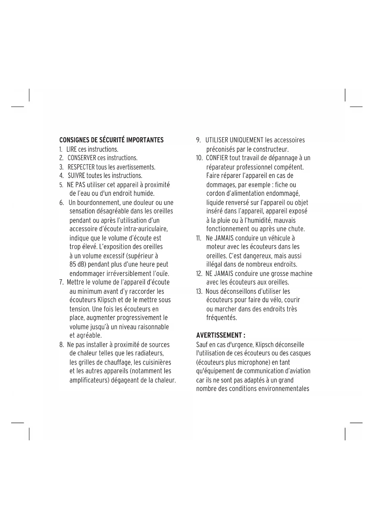 Sauf en cas d'urgence, Klipsch déconseille l'utilisation de ces écouteurs ou des casques (écouteurs plus microphone) en tant qu'équipement de communication d’aviation car ils ne sont pas adaptés à un grand nombre des conditions environnementalesse produisant couramment dans le cas des avions commerciaux ou non-commerciaux (incluant mais sans s'y limiter : l'altitude, la température, les conditions de bruit, les vols sans pressurisation, etc.), qui risquent d’entraîner une interférence avec des communications cruciales. L’administration américaine d’hygiène et de sécurité du travail (OSHA) a publié des recommandations d’utilisation des écouteurs, définissant des niveaux maximaux d’exposition quotidienne et de pression acoustique (mesurée en décibels, dB). Le décibel est l’unité de mesure du son. Le nombre de décibels augmente exponentiellement avec l’intensité du son. Par exemple, le niveau d’une conversation est généralement d’environ 60 dB, et celui d’un concert de rock dans un stade est souvent d’environ 110 dB. DIRECTIVES OSHA POUR LES LIMITES DE DURÉE
