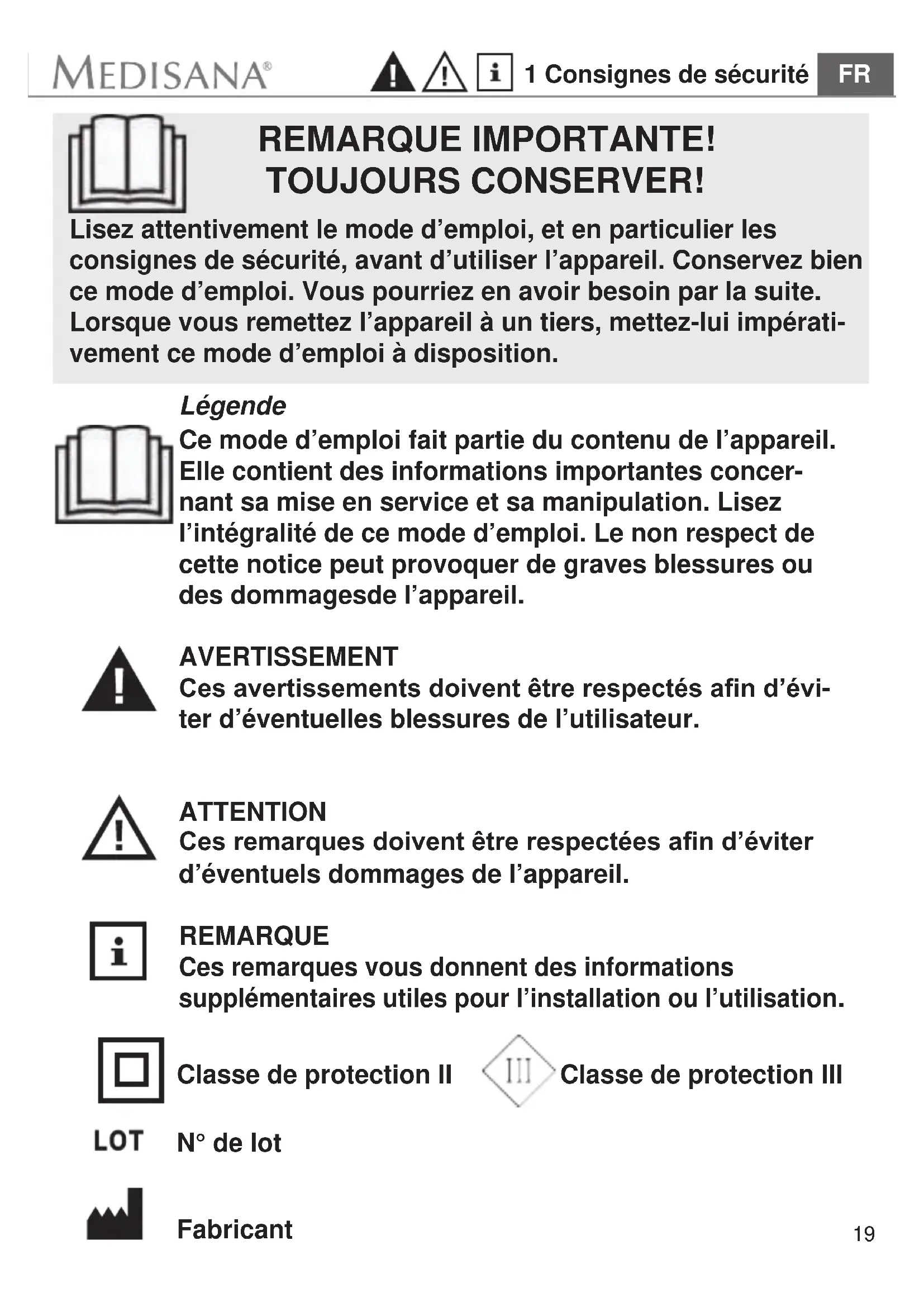 Ces avertissements doivent être respectés afin d'évi-ter d'éventuelles blessures de l'utilisateur.