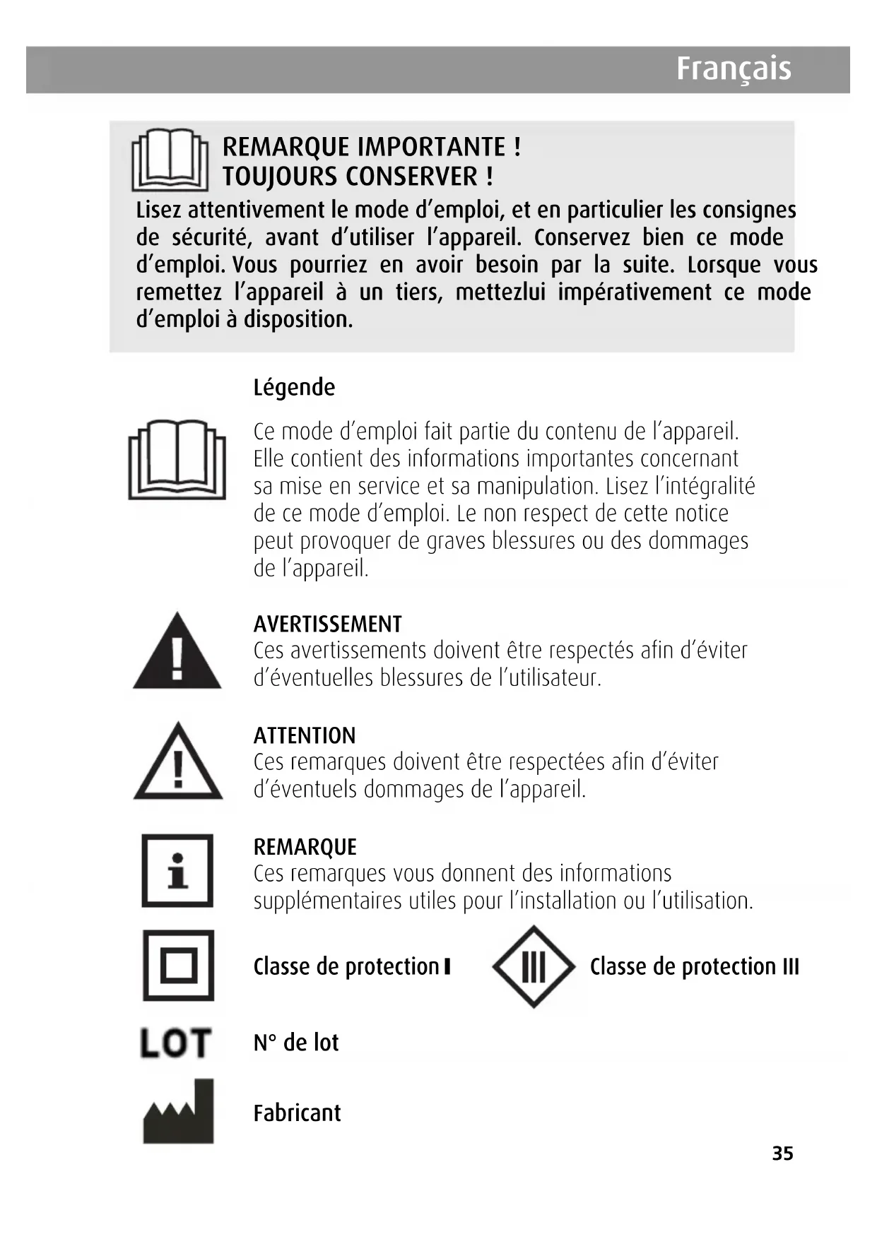 Ce mode d'emploi fait partie du contenu de l'appareil. Elle contient des informations importantes concernant sa mise en service et sa manipulation. Lisez l'intégrité de ce mode d'emploi. Le non respect de cette notice peut provoquer de graves blessures ou des dommages de l'appareil.