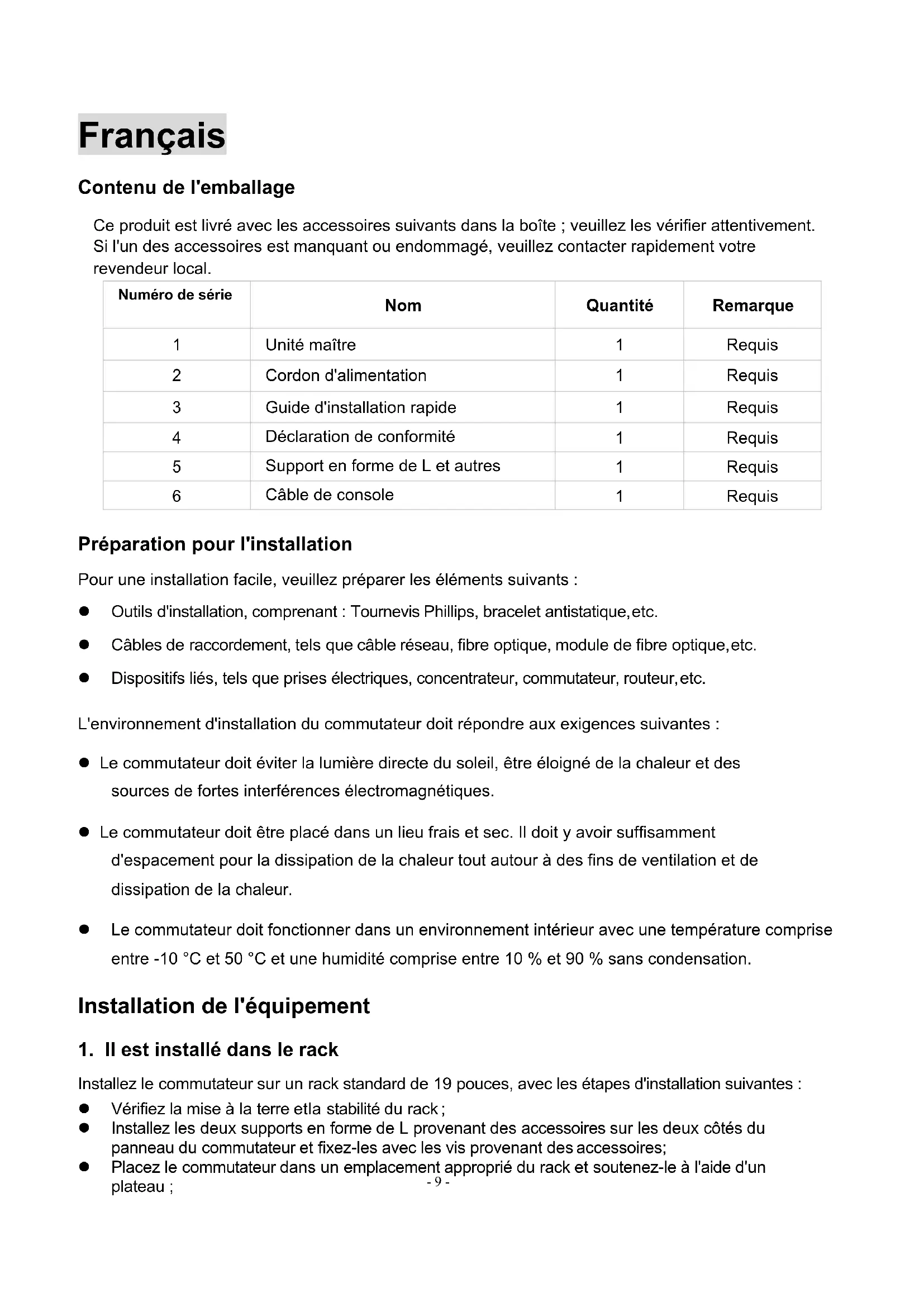 Requis Préparation pour l'installation Pour une installation facile, veuillez préparer les éléments suivants : l Outils d'installation, comprenant : Tournevis Phillips, bracelet antistatique, etc. l Câbles de raccordement, tels que câble réseau, fibre optique, module de fibre optique, etc. l Dispositifs liés, tels que prises électriques, concentrateur, commutateur, routeur, etc. L'environnement d'installation du commutateur doit répondre aux exigences suivantes : l Le commutateur doit éviter la lumière directe du soleil, être éloigné de la chaleur et des sources de fortes interférences électromagnétiques. l Le commutateur doit être placé dans un lieu frais et sec. Il doit y avoir suffisamment d'espacement pour la dissipation de la chaleur tout autour à des fins de ventilation et de dissipation de la chaleur. l Le commutateur doit fonctionner dans un environnement intérieur avec une température comprise entre -10 °C et 50 °C et une humidité comprise entre 10 % et 90 % sans condensation. Installation de l'équipement
