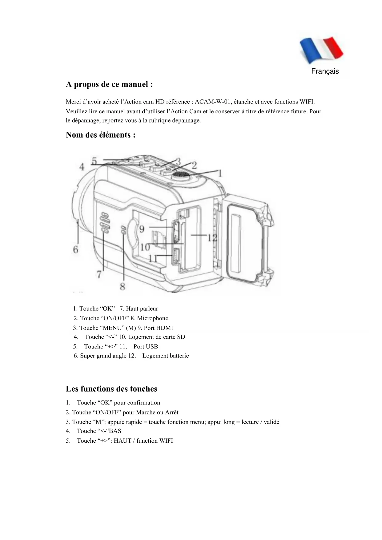 l’appareil avant toute utilisation. Fonctions : 7. Appuyer sur la touche “ON/OFF” pour allumer votre Action CAM. Puis ré-appuyer pour l’arrêt. 8. Par défaut, le démarrage est en mode vidéo. Appuyer sur ”OK” pour commencer l’enregistrement. Puis sur « OK » pour l’arrêt et sauvegarde automatique du fichier vidéo. 9. En mode vidéo, appuyez rapidement sur la touche “MENU” puis entrer dans le menu principal. Et sur la touche OK pour changer de ‘vidéo’ à ‘photo’ ou ‘system’. Appuyer sur la touché “<-” key ou “+>” pour sélectionner. 10. Maintenez-la touché “MENU” pendant 3 secondes pour entrer dans mode de lecture. Appuyer sur la touche “<-” ou “+>” pour sélectionner le fichier à ouvrir (vidéo/photo/event) et puis sur la touche OK pour voir la sélection. Utiliser les touches “<-” ou “+>” pour choisir le fichier. Pour un fichier vidéo, appuyer sur la touche OK pour la lecture. Maintenez la touche “MENU” pour sortir. 11. Appuyer sur la touche “+>” pour le mode WIFI 12. Poussez sur la touche “+>” pour sortir du mode WIFIMenu réglages Changement de mode entre Video-, Photo- et paramètre système. Appuyer sur la touche “POWER” pour allumage, il est en mode veille. Pour entrer dans le réglage de paramètre, appuyer sur la touche “M”. Puis sur touché “OK” pour choisir les menus (video/photo/system). Sélectionner votre choix avec les touches “<-/+>” puis “OK” pour confirmer. Et la touche (M) pour retourner sur le menu précédent. Réglage video Appuyer sur la touche “M” pour aller au menu réglage. Sélection réglage Vidéo est par défaut. Puis les touches “<-/+>” pour choisir l’option et OK pour confirmation Résolution: sélectionner 1920*1080 (30 fps) ou 1280*720 (60 fps). Enregistrement en Loop: Quand l’option est désactivée, la durée des video est limitée à 30 mins. Et l’enregistrement va continuer jusqu’au remplissage de la carte de mémoire. Quand l’option est sélectionnée, chaque vidéo est limitée à 15 minutes sans arrêt sauf lorsque vous appuyez sur le bouton enregistrement ou l’appareil est en arrêt. Si la carte mémoires est pleine. L’action cam va remplacer les anciens fichiers par le dernier enregistrement. Datage : Choisissez l’option datage sur le bouton on/off . Valeur Exposition : Dépendre l’environnement d’enregistrement, sélectionnez EV-2.1…EV-+0.0…EV-+2.1, etc... Réglage Menu photo Press the “M” key to open the settings menu and press OK once to switch to the photo menu. Press the “<-/+>” key to choose the option to be set up as follows and then press the OK key to confirm. Résolution: 2M par défaut. Simple prise: Avec cette option, l’appareil va prendre une prise à la fois. Triple prise: avec cette option, l’appareil va prendre trois prise à la fois/ Compte à rebours : Au choix 5s ou 10s, l’appareil va prendre une prise au bout de 5s ou 10s. En continue: Cette option est de programmer une prise pour chaque 2s, 3s, 5s, 10s, 20s, 30s ou 60s jusqu’au remplissage de la carte de mémoire. Réglages des paramètres Pressez sur la touche “M” pour aller au menu de réglage puis sur OK deux fois pour aller sur le menu de réglage du système. Avec les touches “<-/+>” pour choisir les options de réglages puis OK pour confirmer. Le Son : Le son /Allumage/ tonalité du beep /réglage du volume. Fréquence d’alim : Automatique, 50Hz ou 60Hz. Fond d’écran: Arrêt d’écran après 1min /3min/5min/jamais. Auto extinction : Mode extinction après 1min /3min/5min ou jamais. Date & heure : Régler la date et heure. Appuyer sur la touche “<-/+>” pour augmenter/baisser ; appuyer sur touche OK pour confirmation automatique de “Mois/Jour/Année” et “Heure/Minute”. Langage: Avec la touche “<-/+>” pour choisir le langage; puis OK pour confirmer et retourner au menu. Format: Pour formater votre carte de mémoire type SD. Pressez la touche “<-/+>” puis “Yes” et appuyer sur OK pour débuter le formatage; Et “No” puis OK pour sortir du menu. Rotation d’image : Tourner à 180º. Le RESET : Restaurer les fonctions par défaut Info de la version : Affichage de la version actuelle. Utilisation normale : faire des vidéo, prenez des photos, charger et lecture. Vidéo : Appuyer sur la touche “ POWER” pour allumer votre action Cam. L’appareil démarre toujours en mode vidéo et en pause pour enregistrement. Pressez sur la touche REC/OK pour commencer l’enregistrement. En haut de l’affichage affiche en rouge indicateur “REC”. Pour bloquer la vidéo actuelle, Appuyer sur la touche “+” pendant l’enregistrement. L’indicateur blocage s’allume en haut de l ‘écran et sauvegarde le fichier dans la carte de mémoire. Photo : En mode vidéo, appuyé sur la touche “<-” pour changer en mode photo. L’appareil va prendre une ou + photo selon vos choix ou sélection (simple / triple, continu, etc.). Pressez sur “<-“ pour arrêt. Et retourner en mode vidéo. Chargement : Lorsque votre appareil est connecté pour le chargement, cette fonction est en mode charge automatiquement. Le LED bleu est en marche. En appuyant sur la touche REC/OK, appareil s’arrête de charger et commence à enregistrement de votre vidéo. Lorsque vous débrancher le chargeur. La charge s’arrête automatiquement. Il est possible d’éteindre l’appareil pendant le chargement. L’indicateur LED bleu s’éteint quand la batterie est complètement chargée. Lecture : Maintenez la touche “MENU” pendant 3 sec. pour le menu mode de lecture, appuyer sur les touches “<-/+>” pour choisir entre Event/Vidéo/Photo puis “OK” pour confirmation. Pressez sur la touche OK pour commencer la lecture du fichier vidéo. Maintenez la touche “MENU” pour sortir En mode lecture, appuyer sur “<-/+>” pour effacer ou protéger le fichier. Appuyer sur la touche “MENU” pour entrer dans la fon