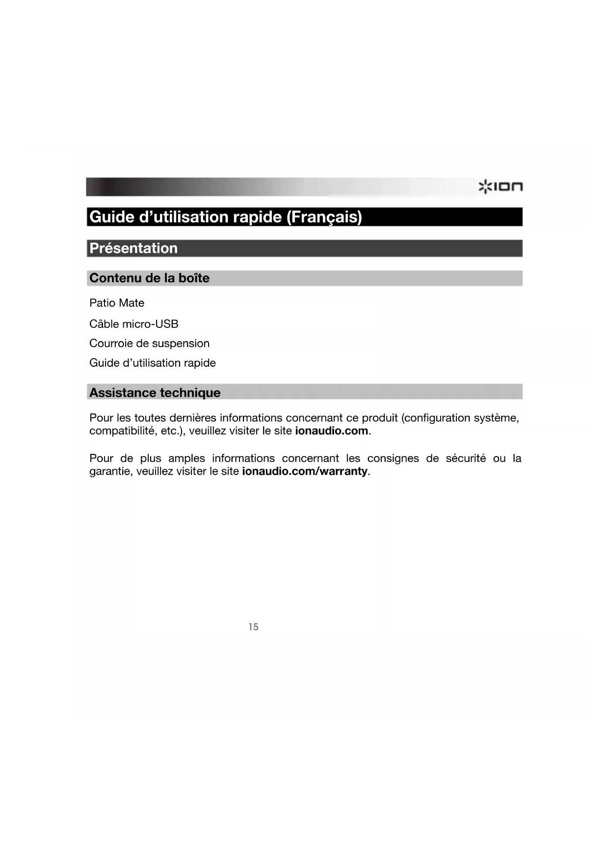 Guide d’utilisation rapide (Français) Présentation Contenu de la boîte Patio Mate Câble micro-USB Courroie de suspension Guide d’utilisation rapide Assistance technique Pour les toutes dernières informations concernant ce produit (configuration système, compatibilité, etc.), veuillez visiter le site ionaudio.com. Pour de plus amples informations concernant les consignes de sécurité ou la garantie, veuillez visiter le site ionaudio.com/warranty.16