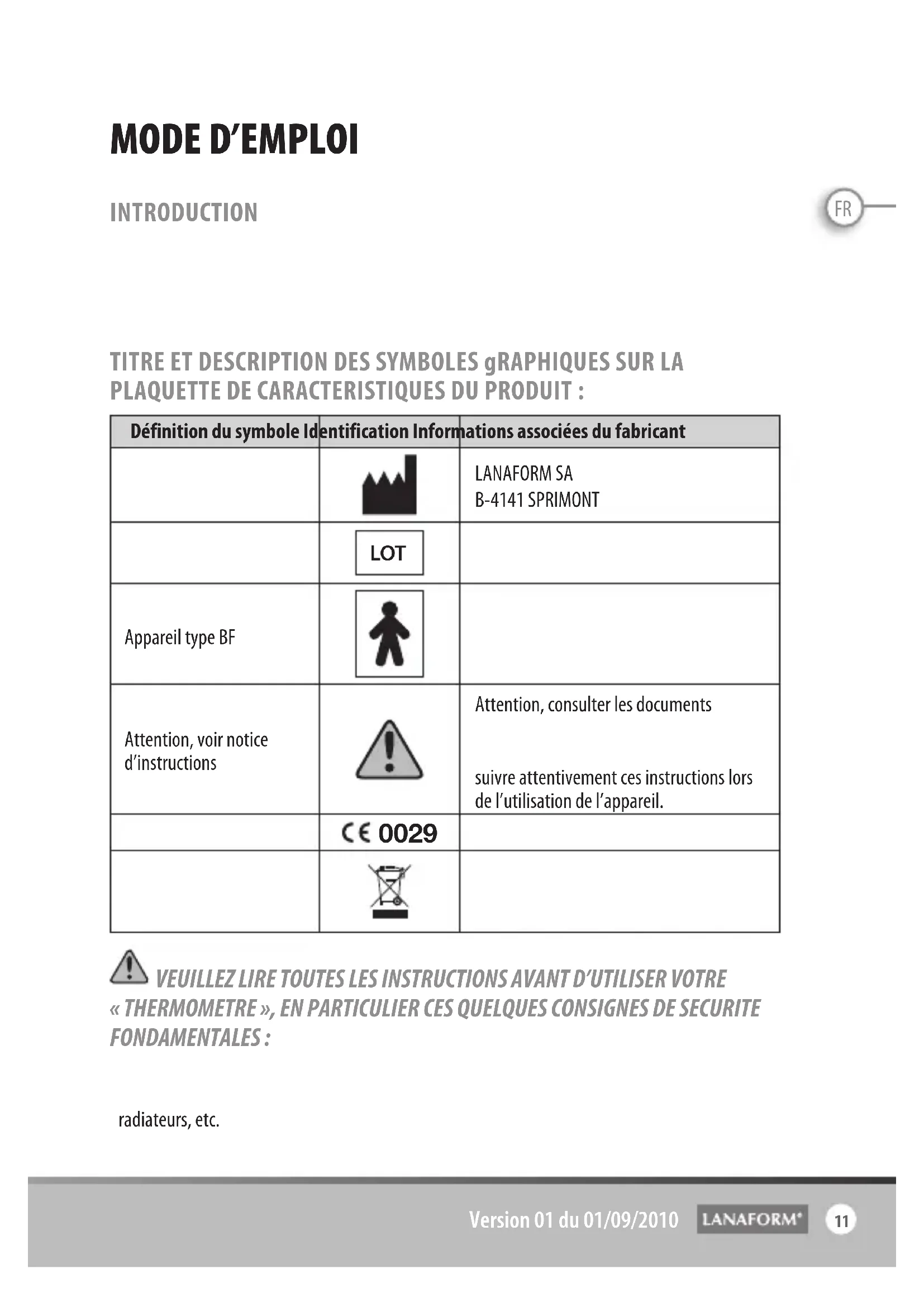 Version 01 dated 01/09/2010FR Mode d’eMploI INTRODUCTION Nous vous remercions d’avoir acheté le « THERMOMETER 4 In 1 » de LANAFORM®. Ce thermomètre auriculaire et frontal de LANAFORM vous assurera une mesure correcte de la température grâce à la technologie infrarouge dont il dispose. TITRE ET DESCRIPTION DES SYMBOLES gRAPHIQUES SUR LA PLAQUETTE DE CARACTERISTIQUES DU PRODUIT : Définition du symbole Identification Informations associées du fabricantCoordonnées du fabricantLANAFORM SAB-4141 SPRIMONTNuméro de lot LOT Appareil type BFAttention, voir notice d’instructionsAttention, consulter les documents joints. Veuillez lire ces instructions avant d’utiliser l’appareil. Veuillez également suivre attentivement ces instructions lors de l’utilisation de l’appareil.Organisme notifié Déchet d’équipement électrique et électronique (DEEE) VEUILLEZ LIRE TOUTES LES INSTRUCTIONS AVANT D’UTILISER VOTRE « THERMOMETRE », EN PARTICULIER CES QUELQUES CONSIGNES DE SECURITE FONDAMENTALES :