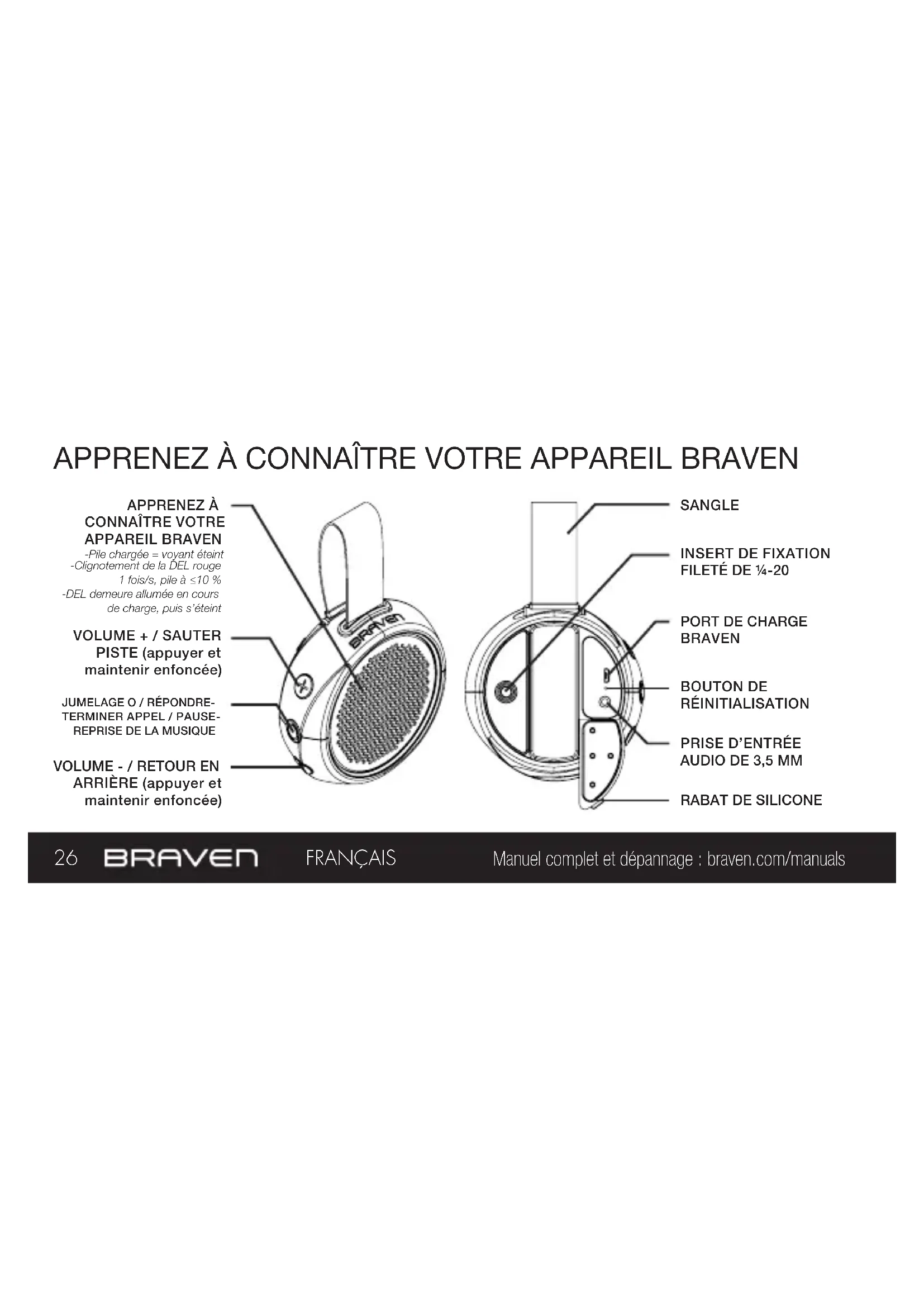Manuel complet et dépannage : braven.com/manuals FRANÇAIS VOLUME + / SAUTER PISTE (appuyer et maintenir enfoncée)
