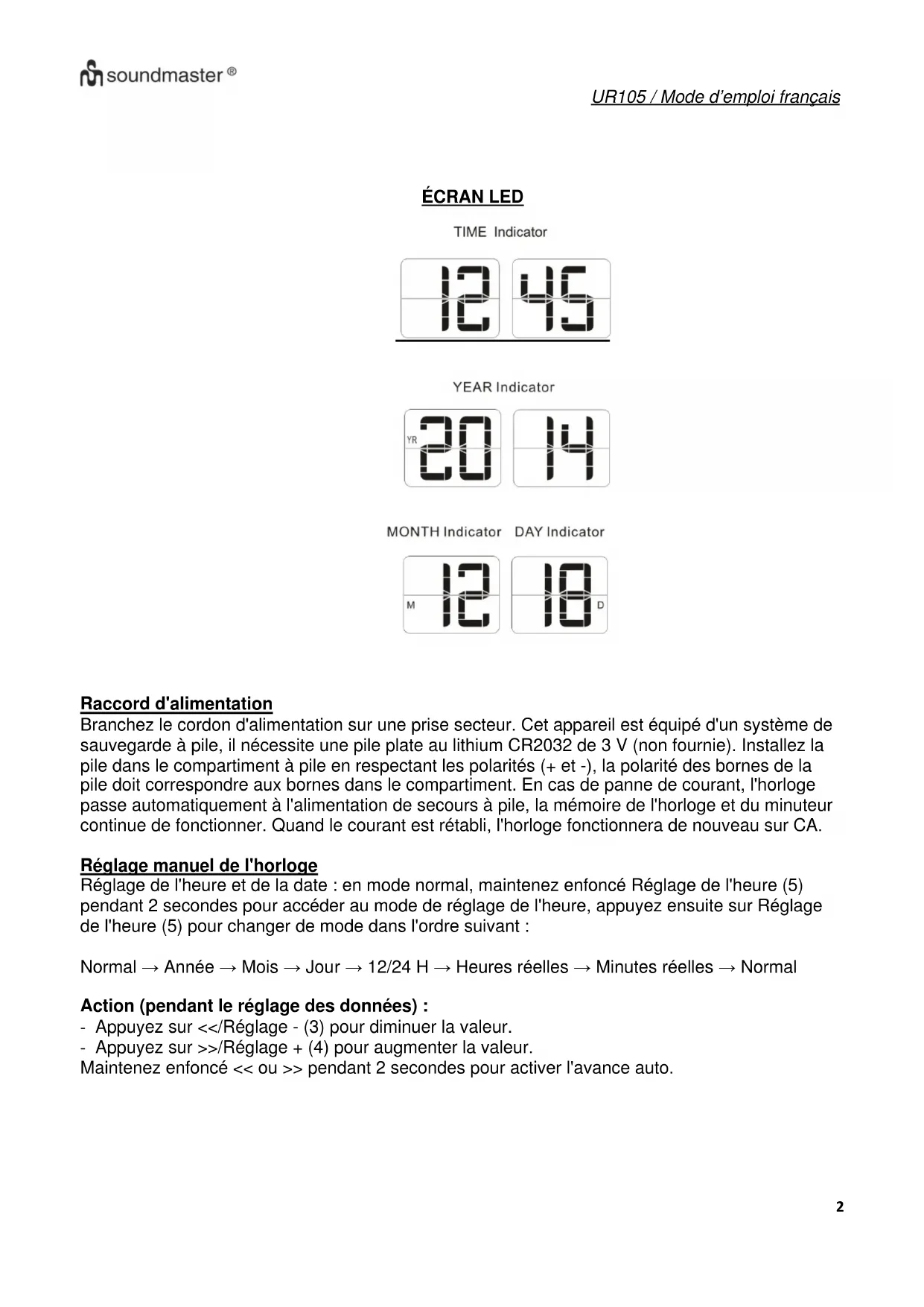 Téléchargez la notice de votre Radio au format PDF gratuitement ! Retrouvez votre notice UR105BR - Soundmaster et reprennez votre appareil électronique en main. Sur cette page sont publiés tous les documents nécessaires à l'utilisation de votre appareil UR105BR de la marque Soundmaster.