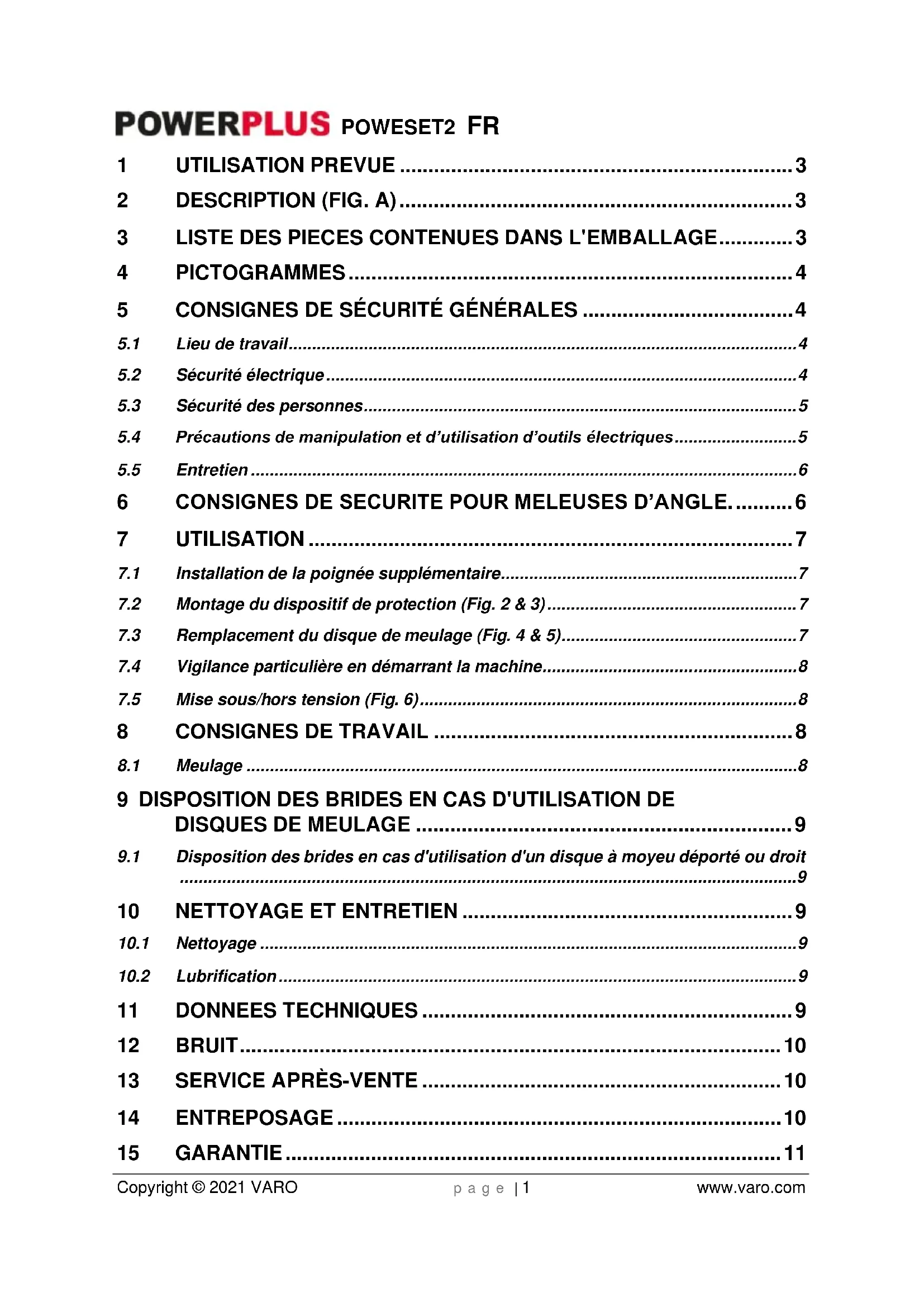 - Entretenez l'appareil avec soin. Contrôlez qu’aucune pièce mobile de l'appareil n’est décentrée ou grippée, qu’aucune pièce n'est cassée ou endommagée au point d'entraver le fonctionnement de l'appareil. Faites réparer les pièces endommagées avant d'utiliser l'appareil. De nombreux accidents sont dus à un entretien défaillant des outils électriques.POWESET2 FR Copyright © 2021 VARO p a g e | 6 www.varo.com