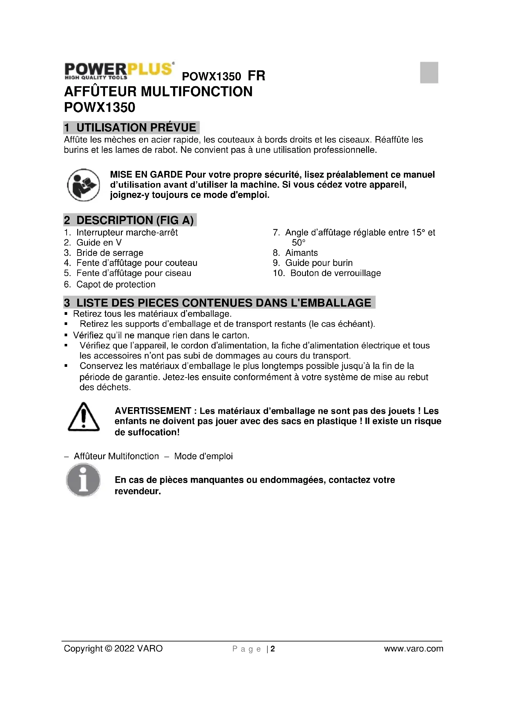 enfants ne doivent pas jouer avec des sacs en plastique ! Il existe un risque de suffocation! − Affûteur Multifonction − Mode d'emploi En cas de pièces manquantes ou endommagées, contactez votre revendeur.POWX1350 FR Copyright © 2022 VARO P a g e | 3 www.varo.com 4 PICTOGRAMMES Les symboles suivants sont utilisés dans ce mode d’emploi et/ou sur la machine: