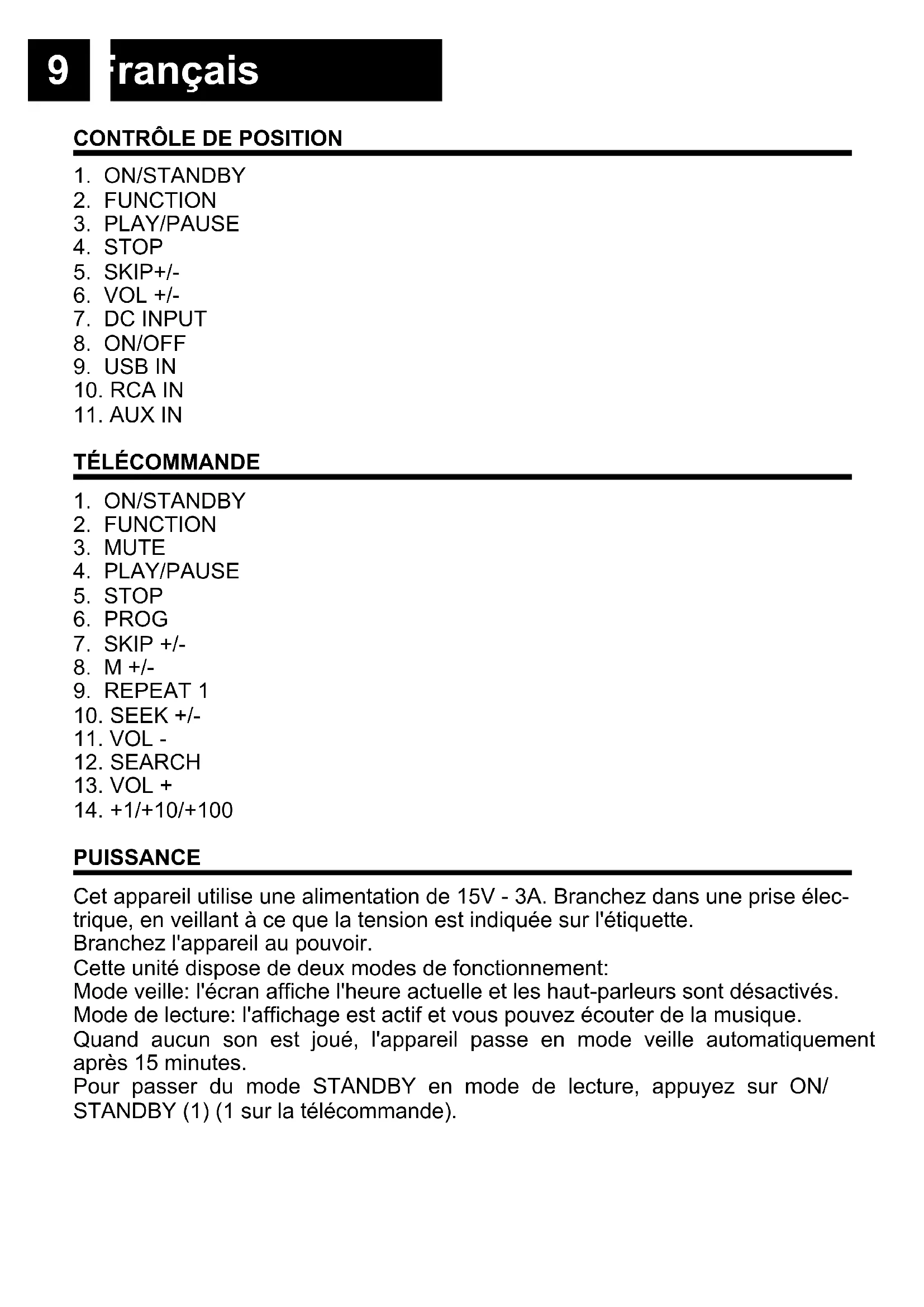 PUISSANCE Cet appareil utilise une alimentation de 15V - 3A. Branchez dans une prise élec- trique, en veillant à ce que la tension est indiquée sur l'étiquette. Branchez l'appareil au pouvoir. Cette unité dispose de deux modes de fonctionnement: Mode veille: l'écran affiche l'heure actuelle et les haut-parleurs sont désactivés. Mode de lecture: l'affichage est actif et vous pouvez écouter de la musique. Quand aucun son est joué, l'appareil passe en mode veille automatiquement après 15 minutes. Pour passer du mode STANDBY en mode de lecture, appuyez sur ON/ STANDBY (1) (1 sur la télécommande).10 Français TIME SET En mode standby: