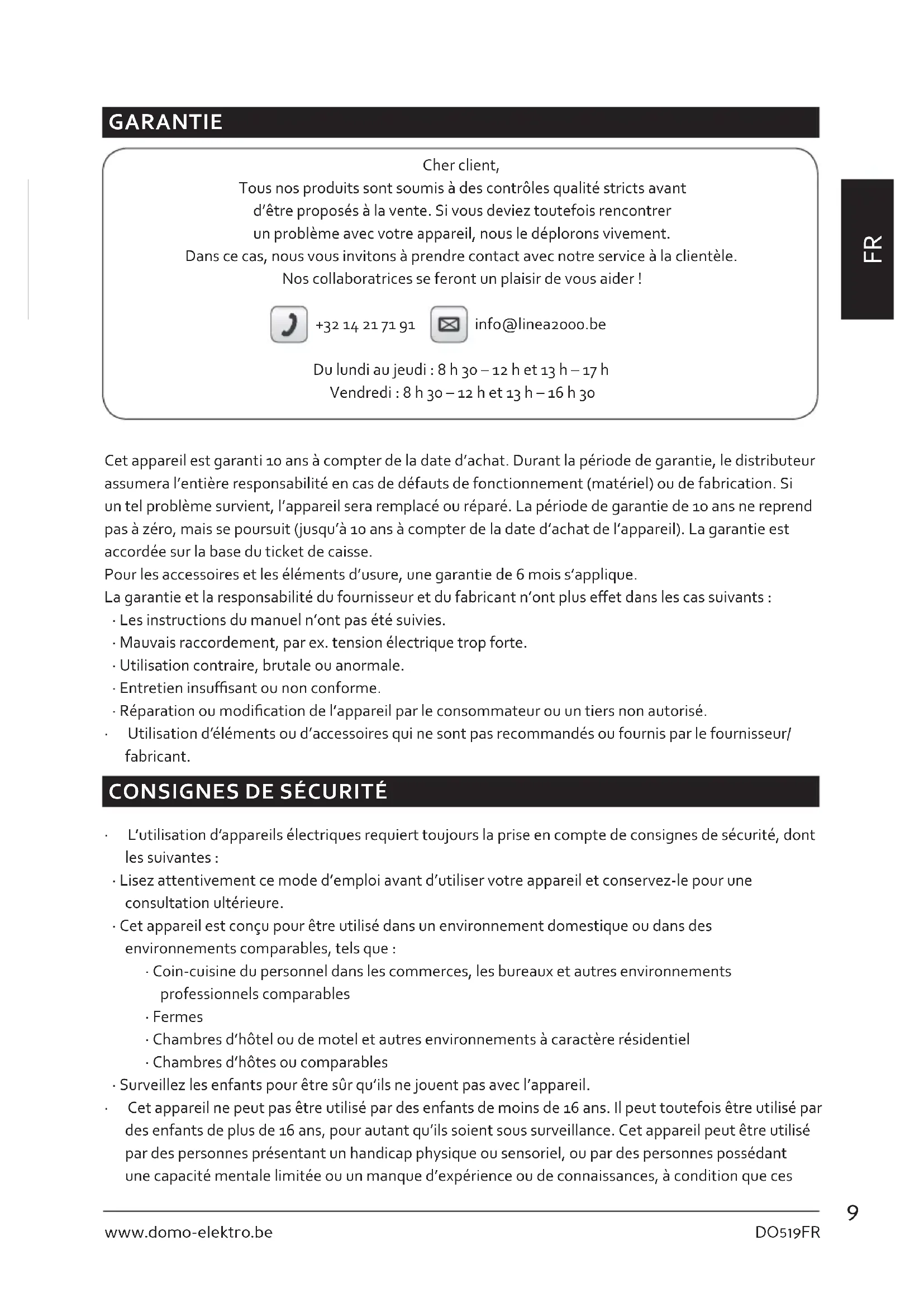 GARANTIE Cher client, Tous nos produits sont soumis à des contrôles qualité stricts avant d’être proposés à la vente. Si vous deviez toutefois rencontrer un problème avec votre appareil, nous le déplorons vivement. Dans ce cas, nous vous invitons à prendre contact avec notre service à la clientèle. Nos collaboratrices se feront un plaisir de vous aider ! +32 14 21 71 91 info@linea2000.be Du lundi au jeudi : 8 h 30 – 12 h et 13 h – 17 h Vendredi : 8 h 30 – 12 h et 13 h – 16 h 30 Cet appareil est garanti 10 ans à compter de la date d’achat. Durant la période de garantie, le distributeur assumera l’entière responsabilité en cas de défauts de fonctionnement (matériel) ou de fabrication. Si un tel problème survient, l’appareil sera remplacé ou réparé. La période de garantie de 10 ans ne reprend pas à zéro, mais se poursuit (jusqu’à 10 ans à compter de la date d’achat de l’appareil). La garantie est accordée sur la base du ticket de caisse. Pour les accessoires et les éléments d’usure, une garantie de 6 mois s’applique. La garantie et la responsabilité du fournisseur et du fabricant n’ont plus eet dans les cas suivants :