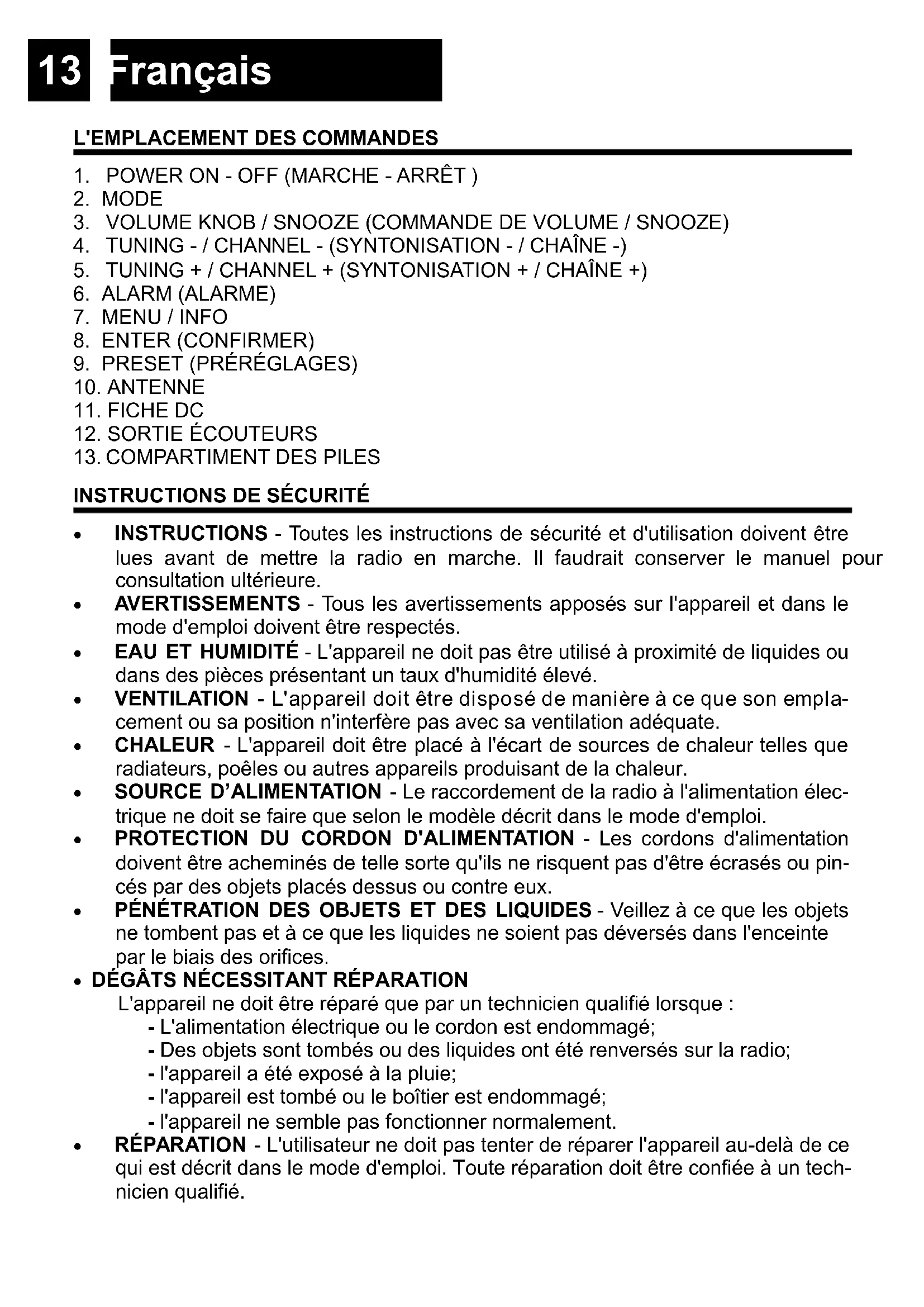 INSTRUCTIONS - Toutes les instructions de sécurité et d'utilisation doivent être lues avant de mettre la radio en marche. Il faudrait conserver le manuel pour consultation ultérieure. AVERTISSEMENTS - Tous les avertissements apposés sur l'appareil et dans le mode d'emploi doivent être respectés. EAU ET HUMIDITÉ - L'appareil ne doit pas être utilisé à proximité de liquides ou dans des pièces présentant un taux d'humidité élevé. VENTILATION - L'appareil doit être disposé de manière à ce que son empla- cement ou sa position n'interfère pas avec sa ventilation adéquate. CHALEUR - L'appareil doit être placé à l'écart de sources de chaleur telles que radiateurs, poêles ou autres appareils produisant de la chaleur. SOURCE D’ALIMENTATION - Le raccordement de la radio à l'alimentation élec- trique ne doit se faire que selon le modèle décrit dans le mode d'emploi. PROTECTION DU CORDON D'ALIMENTATION - Les cordons d'alimentation doivent être acheminés de telle sorte qu'ils ne risquent pas d'être écrasés ou pin- cés par des objets placés dessus ou contre eux. PÉNÉTRATION DES OBJETS ET DES LIQUIDES - Veillez à ce que les objets ne tombent pas et à ce que les liquides ne soient pas déversés dans l'enceinte par le biais des orifices. DÉGÂTS NÉCESSITANT RÉPARATION L'appareil ne doit être réparé que par un technicien qualifié lorsque : - L'alimentation électrique ou le cordon est endommagé; - Des objets sont tombés ou des liquides ont été renversés sur la radio; - l'appareil a été exposé à la pluie; - l'appareil est tombé ou le boîtier est endommagé; - l'appareil ne semble pas fonctionner normalement. RÉPARATION - L'utilisateur ne doit pas tenter de réparer l'appareil au-delà de ce qui est décrit dans le mode d'emploi. Toute réparation doit être confiée à un tech- nicien qualifié.14 Français Remarque: Si L'affichage ne fonctionne pas correctement ou aucune réac- tion au fonctionnement d'une commande quelconque pourrait être due à une dé- charge électrostatique, éteindre, débrancher le cordon d'alimentation CA et retirer toutes les piles, puis remettre l'appareil sous tension après quelques secondes. SOURCES D'ALIMENTATION ALIMENTATION CA : Pour alimenter la chaîne stéréo portative, il suffit de bran- cher le cordon d'alimentation dans la fiche DC (11) située à l'arrière de l'appareil et dans une prise de courant CA murale. Vérifier que la tension nominale de l`appareil correspond à la tension locale. Vérifier que le cordon d'alimentation est complètement inséré dans l'appareil. PILES ÉLECTRIQUE : Pour faire fonctionner la radio avec des piles, débrancher le cordon d'alimentation CA et insérer 4 piles "LR6" dans le compartiment (13). S'assurer que les piles sont correctement insérées pour éviter d'endommager l'appa- reil. Retirer les piles lorsque la radio ne sera pas utilisée pendant une longue période de temps, car cela causera des fuites dans les piles et endommagera la radio.