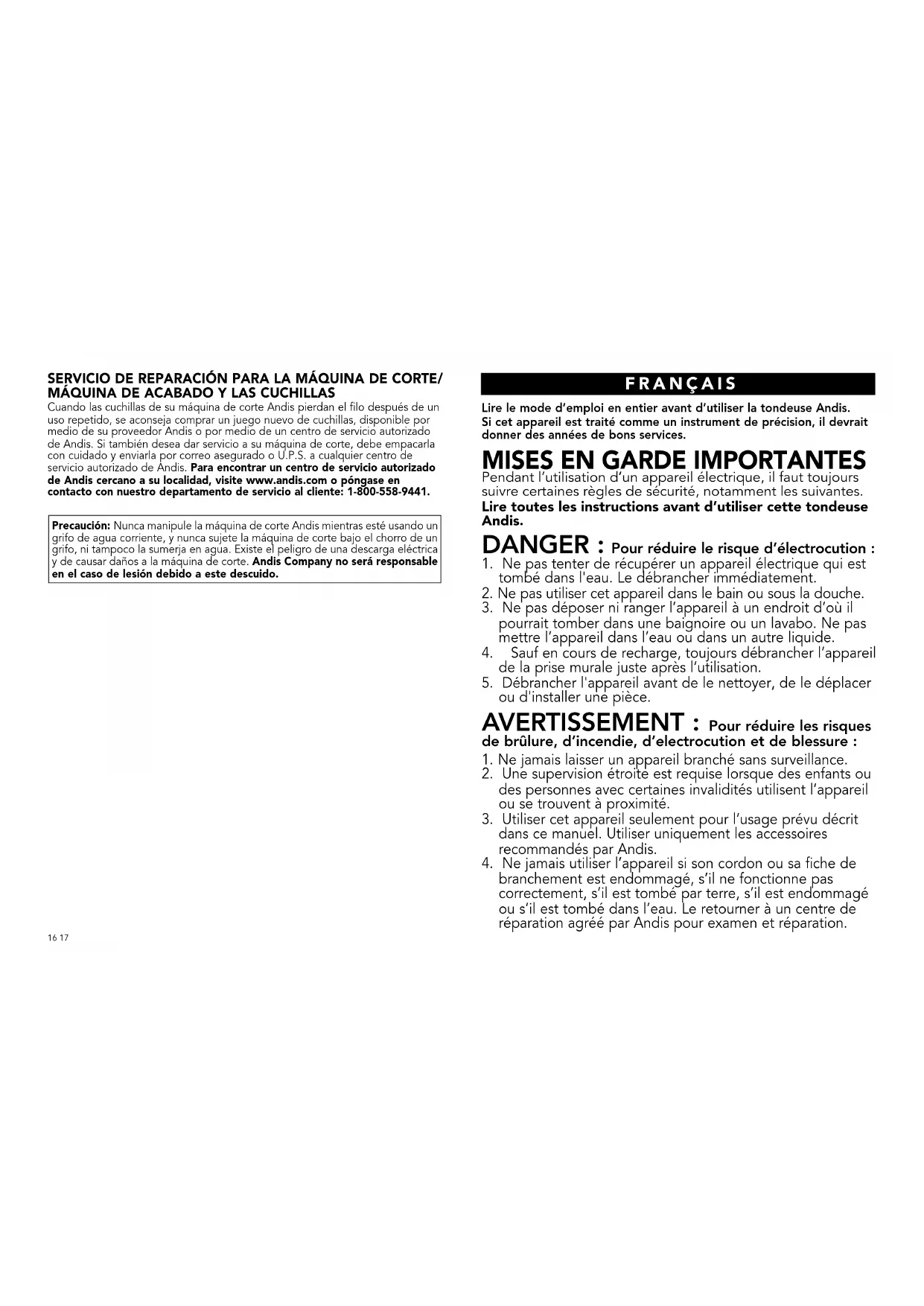 Attention: Ne jamais manipuler la tondeuse Andis tout en réglant le débit d'un robinet d'eau, la tenir sous un filet d'eau ni la plonger dans l'eau. De telles manœuvres représentent un risque d'électrocution et d'endommagement de la tondeuse. Andis Company ne pourrait être tenue responsable de blessures qui font suite à une négligence.
