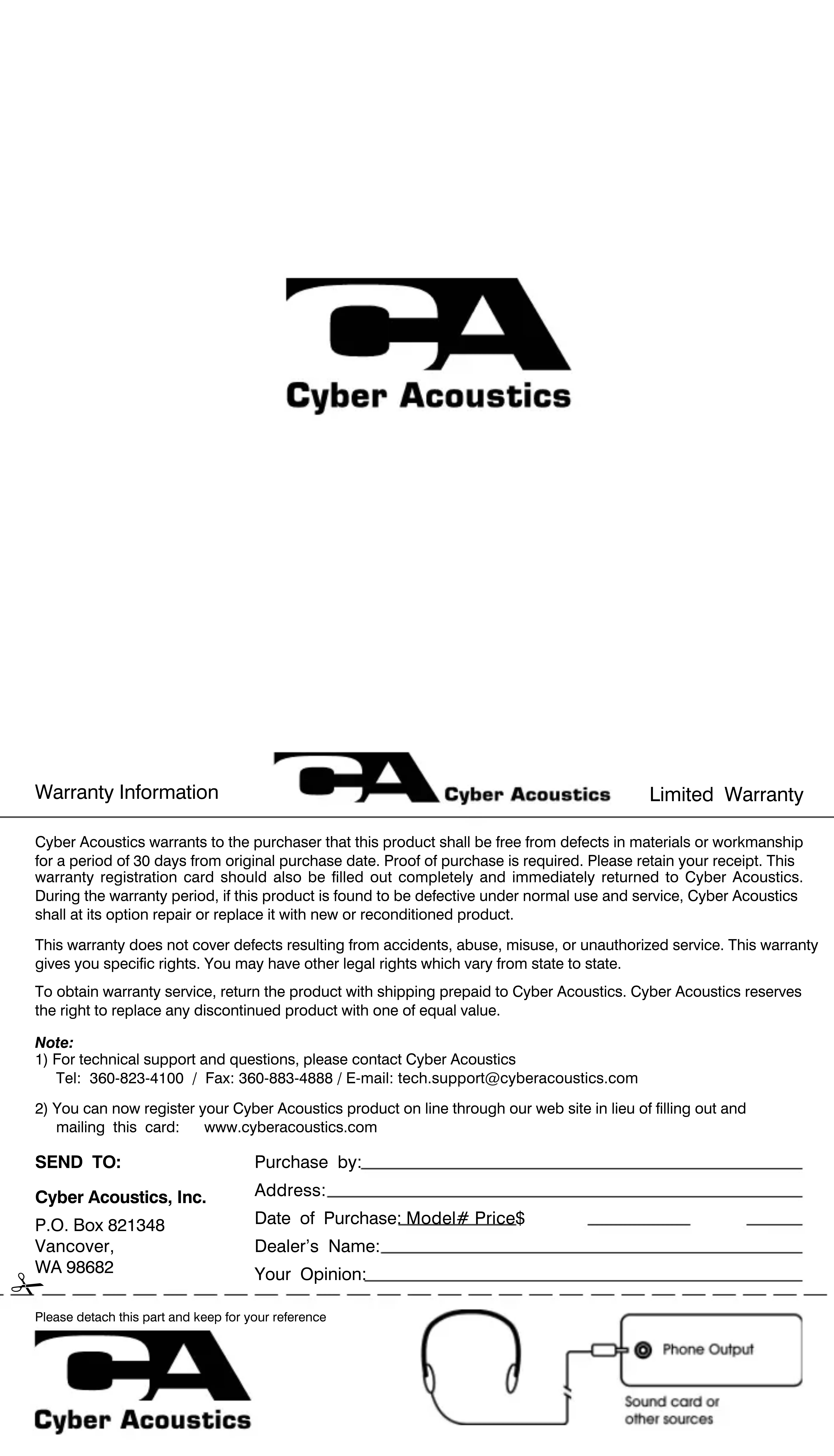 1) Pour le support et les questions techniques, adressez-vous à Cyber Acoustics Tel: 360-823-4100/Fax: 360-883-4888/Courrier électronique : tech/support@cyberacoustics.com 2) Vous pouvez à présent enregistrer votre produit Cyber Acoustics en ligne, via le site Web ou remplir cette carte et la renvoyer par la poste : www.cyberacoustics.com