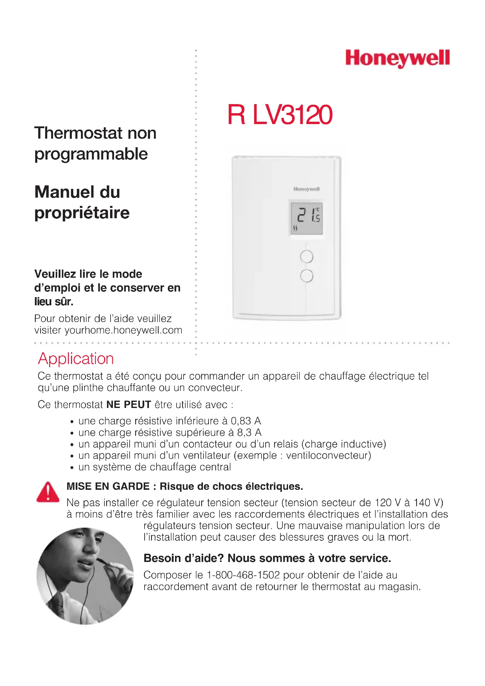 - Le thermostat est situé près ou au-dessus d’une source de chaleur tel qu’un gradateur de lumière. L’afchage disparaît et ne réapparaît qu’après quelques minutes. La protection thermique de la plinthe était temporairement ouverte. Ceci peut se produire suite à une surchauffe lorsque la plinthe est obstruée par un meuble ou un rideau, ou si la protection thermique de la plinthe est trop sensible.11 Caractéristiques Alimentation : 120/240 V c.a., 60 Hz Charge minimale : 0,83 A (résistive seulement) 200 W @ 240 V c.a. 100 W @ 120 V c.a. Charge maximale : 10,4 A (résistive seulement) 2000 W @ 240 V c.a. 1000 W @ 120 V c.a. Plage d’affichage : 0 °C à 50 °C (32 °F à 99 °F) Plage de réglage : 5 °C à 30 °C (40 °F à 85 °F) Entreposage : -20 °C à 50 °C (-4 °F à 120 °F) Cycle de chauffage : 15 secondes Mémoire permanente : Il n’est pas nécessaire de régler la température de consigne après une panne de courant.33-00149EF-01 ® Marque de commerce déposée aux É.-U. © 2015 Honeywell International Inc. 33-00149EF—01 M.S. 09-15 Imprimé aux États-Unis Solutions de régulation et d’automatisation Honeywell International Inc. 1985 Douglas Drive North Golden Valley, MN 55422 yourhome.honeywell.com Garantie limitée d’un an Honeywell garantit ce produit, à l’exception des piles, contre tout défaut de pièce ou de main-d’œuvre, durant une période d’un (1) an à partir de la date d’achat par le consommateur si le produit est utilisé et entretenu convenablement. En cas de défectuosité ou de mauvais fonctionnement pendant la période de garantie, Honeywell remplacera ou réparera le produit, à sa discrétion. Si le produit est défectueux, (i) le renvoyer avec la facture ou une autre preuve d’achat date au lieu d’achat; ou (ii) appeler le service à la clientèle de Honeywell en composant le 1-855-733-5465. Le service à la clientèle déterminera si le produit doit être retourné à l’adresse suivante : Honeywell Return Goods, Dock 4MN10-3860, 1985 Douglas Dr. N., Golden Valley, MN 55422, ou si un produit de remplacement peut vous être expédié. La présente garantie ne couvre pas les frais de retrait ou de réinstallation. La présente garantie ne s’appliquera pas s’il est démontré par Honeywell que la défectuosité ou le mauvais fonctionnement sont dus à un endommagement du produit alors que le consommateur l’avait en sa possession. La responsabilité exclusive de Honeywell se limite à réparer ou à remplacer le produit conformément aux modalités susmentionnées. HONEYWELL N’EST EN AUCUN CAS RESPONSABLE DES PERTES OU DOMMAGES, Y COMPRIS LES DOMMAGES INDIRECTS OU ACCESSOIRES DÉCOULANT DIRECTEMENT OU INDIRECTEMENT D’UNE VIOLATION QUELCONQUE D’UNE GARANTIE, EXPRESSE OU TACITE, APPLICABLE AU PRÉSENT PRODUIT, OU TOUTE AUTRE DÉFECTUOSITÉ DU PRÉSENT PRODUIT. Certaines provinces ne permettent pas l’exclusion ou la restriction des dommages indirects ou accessoires et, par conséquent, la présente restriction peut ne pas s’appliquer. CETTE GARANTIE EST LA SEULE GARANTIE EXPRESSE FAITE PAR HONEYWELL POUR CE PRODUIT. LA DURÉE DE TOUTE GARANTIE IMPLICITE, INCLUANT LES GARANTIES DE QUALITÉ MARCHANDE OU D’ADAPTATION À UNE UTILISATION PARTICULIÈRE, EST LIMITÉE PAR LES PRÉSENTES À LA PÉRIODE D’UNE ANNÉE DE LA PRÉSENTE GARANTIE. Certaines provinces ne permettent pas de limiter la durée des garanties tacites et, par conséquent, la présente limitation peut ne pas s’appliquer. La présente garantie donne au consommateur des droits spécifiques et certains autres droits qui peuvent varier d’une province à l’autre. Pour toute question concernant la présente garantie, prière d’écrire aux Services à la clientèle de Honeywell à l’adresse suivante : Honeywell Customer Relations, 1985 Douglas Dr, Golden Valley, MN 55422 ou composer le 1-855-733-5465.