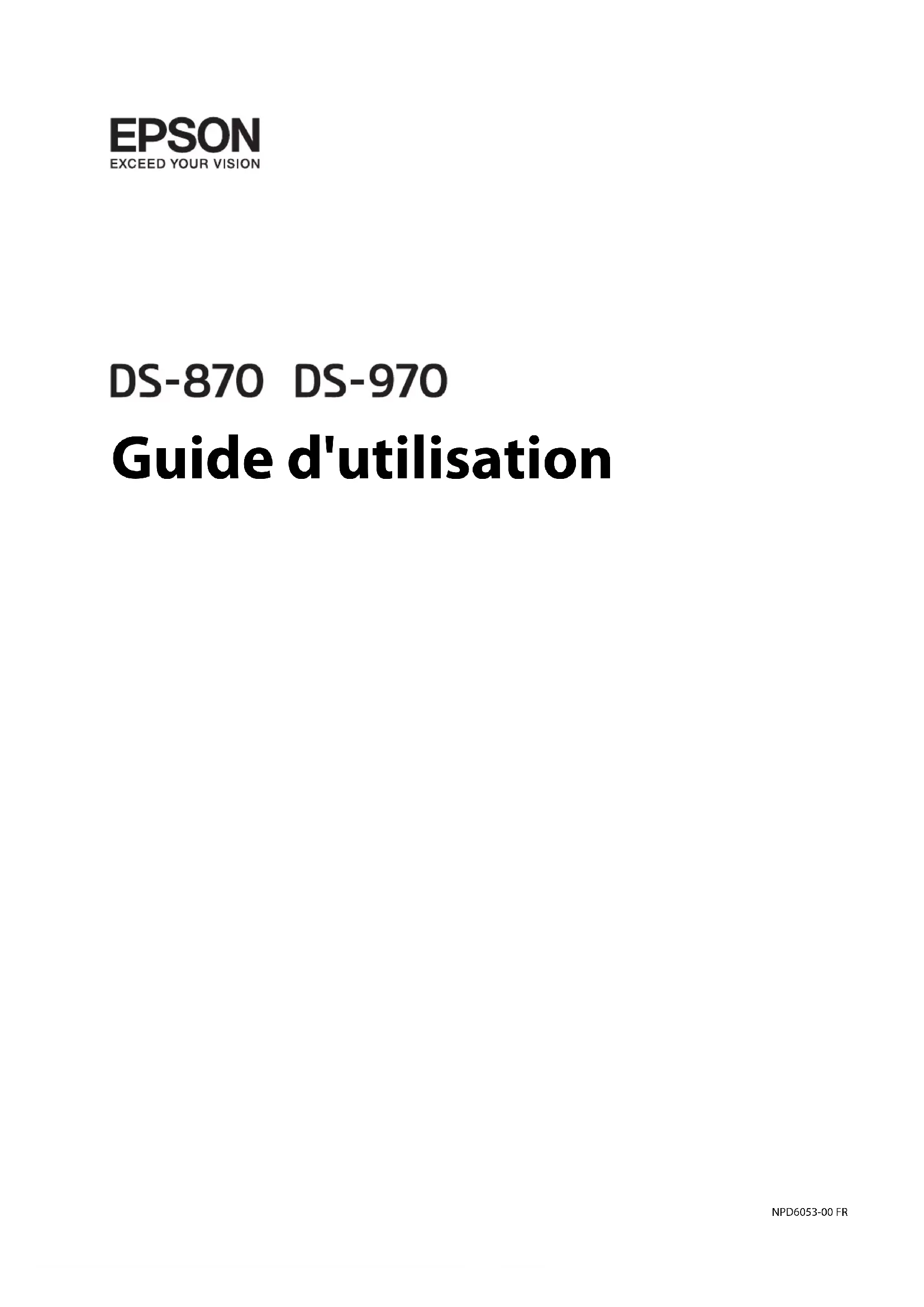 http://epson.sn Remarque: Pour Windows, vous pouvez également utiliser le CD du logiciel fourni avec le scanner. Guide d'utilisation Résolution des problèmes 131Caractéristiques techniques Caractéristiques générales du scanner Remarque: Les caractéristiques techniques peuvent être modiées sans préavis. Type de scanner Scanner couleur recto verso en une passe, à chargeurDispositif photoélectrique CISPixels eectifs 5,100×9,300 à 600 ppp2,550×64,500 à 300 pppSource lumineuse LED RVBRésolution de numérisation 600 ppp (numérisation principale)600 ppp (numérisation secondaire)Résolution de sortie50 à 1200 dpi (par paliers de 1 dpi) Taille du document Max : 215.9×6,096 mm (8.5×240 pouces)Min : 50.8×50.8 mm (2×2 pouces)Insertion du papier Chargement face vers le basSortie du papier Éjection face vers le basCapacité de papier 100 feuilles de papier à 80 g/mProfondeur de couleur Couleur❏ 30 bits par pixel en interne (10 bits par pixel par couleur en interne)❏ 24 bits par pixel en externe (8 bits par pixel par couleur en externe)Nuances de gris❏ 10 bits par pixel en interne❏ 8 bits par pixel en externeNoir et blanc❏ 10 bits par pixel en interne❏ 1 bit par pixel en externeInterface SuperSpeed USB* Vous pouvez numériser du papier long dans les résolutions suivantes. ❏ 50 à 600 ppp : 393,8 à 1346,2 mm (15,5×53 pouces) dans la longueur ❏ 50 à 300 ppp : 1346,3 à 5461,0 mm (53×215 pouces) dans la longueur ❏ 50 à 200 ppp : 5461,1 à 6096,0 mm (215×240 pouces) dans la longueur Guide d'utilisation Caractéristiques techniques 132Caractéristiques de dimensions et de poids Dimensions* Largeur : 296 mm (11.7 pouces)Profondeur : 169 mm (6.7 pouces)Hauteur : 167 mm (6.6 pouces)Poids Environ 3.6 kg (7.9 lb)* Sans pièces saillantes et le bac d'insertion. Caractéristiques électriques Caractéristiques électriques du scanner Tension nominale CC en entrée del’alimentation24 V CCCourant CC nominal en entrée 2 AConsommation électrique DS-870 :❏ En fonctionnement : Environ 18 W❏ Mode prêt à l’emploi : Environ 8.5 W❏ Mode veille : Environ 1.4 W❏ Arrêt : Environ 0.1 WDS-970 :❏ En fonctionnement : Environ 20 W❏ Mode prêt à l’emploi : Environ 8.5 W❏ Mode veille : Environ 1.4 W❏ Arrêt : Environ 0.1 W Remarque: Pour les utilisateurs européens, consultez le site Web suivant pour plus obtenir plus de détails sur la consommation énergétique. http://www.epson.eu/energy-consumption Caractéristiques électriques de l’adaptateur secteur Modèle A471H (AC 100–240 V)A472E (AC 220–240 V)Courant nominal en entrée 1.2 APlage de fréquences nominales 50–60 Hz Guide d'utilisation Caractéristiques techniques 133Tension nominale en sortie de l’alimentation 24 V CC Courant nominal en sortie 2 A Caractéristiques environnementales Température Fonctionnement 5 à 35 °C (41 à 95 °F) Stockage –25 à 60 °C (–13 à 140 °F) Humidité Fonctionnement 15 à 80 % (sans condensation) Stockage 15 à 85 % (sans condensation) Conditions de fonctionnement Conditions ambiantes habituelles au domicile ou au bureau. Évitez de faire fonctionner le scanner à la lumière directe du soleil, à proximité d'une source d'éclairage intense ou dans des lieux extrêmement poussiéreux. Conguration système requise Windows