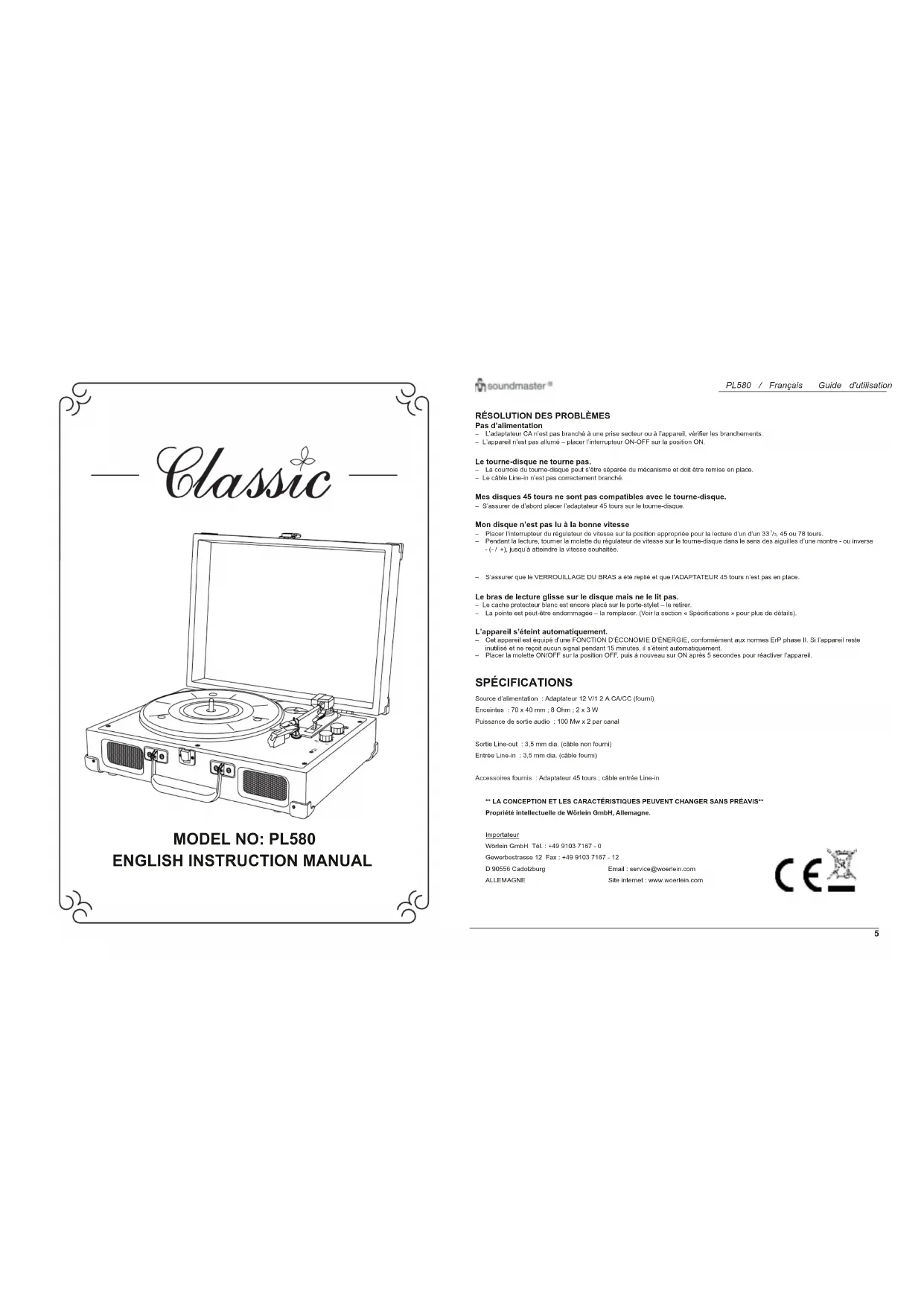 , 45 ou 78 tours. – Pendant la lecture, tourner la molette du régulateur de vitesse sur le tourne-disque dans le sens des aiguilles d’une montre - ou inverse +), jusqu’à atteindre la vitesse souhaitée. Mon disque 33ѿ tours oscille lorsqu’il est placé sur le tourne-disque. – S’assurer que le VERROUILLAGE DU BRAS a été replié et que l’ADAPTATEUR 45 tours n’est pas en place. Le bras de lecture glisse sur le disque mais ne le lit pas. – Le cache protecteur blanc est encore placé sur le porte-stylet – le retirer. – La pointe est peut-être endommagée – la remplacer. (Voir la section « Spécifications » pour plus de détails). L’appareil s’éteint automatiquement. – Cet appareil est équipé d’une FONCTION D’ÉCONOMIE D’ÉNERGIE, conformément aux normes ErP phase II. Si l’appareil reste et ne reçoit aucun signal pendant 15 minutes, il s’éteint automatiquement. – Placer la molette ON/OFF sur la position OFF, puis à nouveau sur ON après 5 secondes pour réactiver l’appareil. SPÉCIFICATIONS Source d’alimentation : Adaptateur 12 V/1 2 A CA/CC (fourni) Enceintes : 70 x 40 mm ; 8 Ohm ; 2 x 3 W Puissance de sortie audio : 100 Mw x 2 par canal Tourne-disque 3 vitesses : 33ѿ, 45, 78 tours/minute Sortie Line-out : 3,5 mm dia. (câble non fourni) Entrée Line-in : 3,5 mm dia. (câble fourni) Stylet : Pointe universelle (pour 33ѿ, 45 et 78 tours*) Accessoires fournis : Adaptateur 45 tours ; câble entrée Line-in ** LA CONCEPTION ET LES CARACTÉRISTIQUES PEUVENT CHANGER SANS PRÉAVIS** Propriété intellectuelle de Wörlein GmbH, Allemagne. Importateur Wörlein GmbH Tél. : +49 9103 7167 - 0 Gewerbestrasse 12 Fax : +49 9103 7167 - 12 D 90556 Cadolzburg Email : service@woerlein.com ALLEMAGNE Site internet : www.woerlein.com