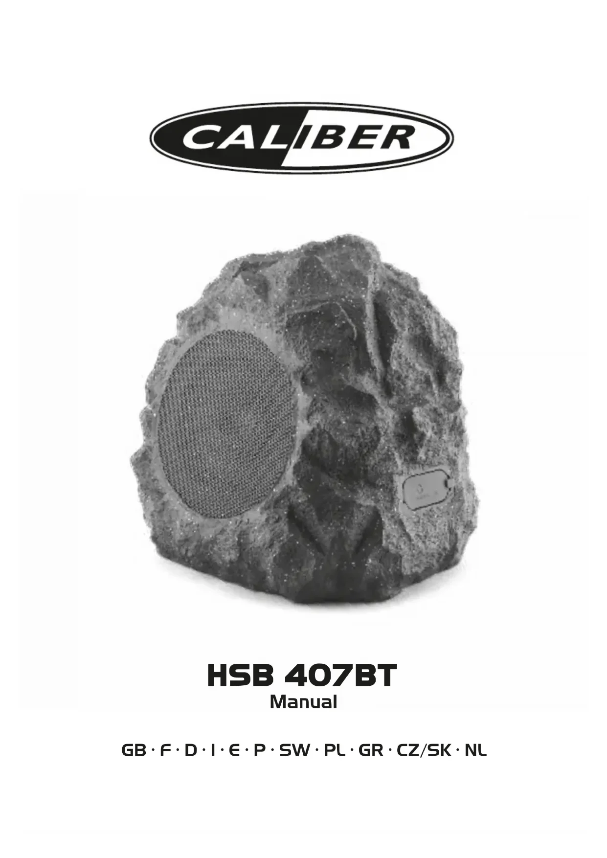 - The sub speaker has been connected and will stop blinking, the master speaker is still blinking, waiting for connection.• You will see only one pairing name on your phone list (or other device). Choose “HSB407BT_CALIBER”, to get connected with the master speaker and your phone, you will hear another ‘connected’. The master speaker will stop blinking.Disconnect:• Double press the power button on the master speaker, it will disconnect with the sub speaker.• Again double press the power button on the master speaker, sub speaker will be connected.Note: The BT distance between phone and master speaker, master and sub speaker is 10 meters.AUX-IN:For the optional wired connection you can connect an external device e.g. MP3/MP4 player to the AUX-in of the HSB407BT using the provided jack-to-jack cable.• When an external device is connected, it automaticcally switches to Line-in mode.• Start playing music on your external device.Chargement de la pileCet appareil est équipé d’une pile lithium rechargeable intégrée. Rechargez la pile pendant 5 heures lors du premier chargement. Un câble USB vers mini-USB est fourni avec l’appareil.Branchez le câble USB sur un port USB de 5 V, et l’autre extrémité sur l’entrée DC-in de l’appareil. Pendant le charge-ment, un témoin lumineux s’allume, puis s’éteint une fois le chargement terminé.Connexion via Bluetooth• Mettez l’enceinte sous tension (en appuyant sur le seul bouton du rocher). Vous verrez alors le voyant LED bleu de l’enceinte clignoter (en attente de connexion).• Choisissez le nom d’appariement « HSB407BT_CALIBER » dans la liste de votre téléphone (ou de tout autre ap-pareil) pour connecter l’enceinte à votre téléphone. Vous entendrez alors « connected » (« connecté »). Que la fête commence !Déconnexion :• Appuyez deux fois ou maintenez la pression sur le bouton de l’enceinte. Elle se déconnecte alors.Connexion de deux enceintes (pour former une paire, une seconde enceinte doit être achetée)• Mettez les deux enceintes sous tension (en appuyant sur le seul bouton du rocher). Vous verrez alors le voyant LED bleu des deux enceintes clignoter (en attente de connexion).• Choisissez l’une des enceintes, appuyez deux fois sur le bouton d’alimentation pour en faire l’enceinte maîtresse (l’enceinte maîtresse se connecte à votre appareil de lecture multimédia Bluetooth ou au AUX-in par sélection automatique).• Au bout de 2 secondes, vous entendrez « connected » (« connecté »). Les deux enceintes sont alors connectées.• L’enceinte secondaire est connectée et cesse de clignoter. L’enceinte maîtresse clignote toujours, en attente de connexion.• Vous ne verrez qu’un seul nom d’appariement dans la liste de votre téléphone (ou de tout autre appareil). Choisis-sez « HSB407BT_CALIBER » pour connecter l’enceinte maîtresse à votre téléphone. Vous entendrez alors à nouveau « connected » (« connecté »). L’enceinte maîtresse cesse de clignoter.Déconnexion :