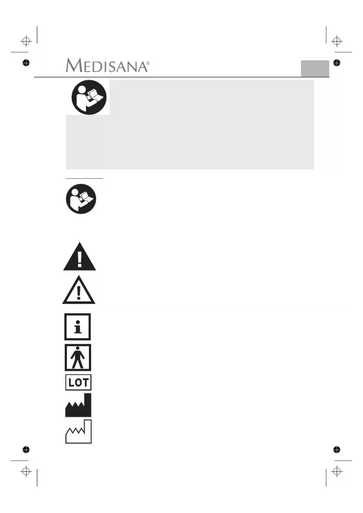 are excluded even if the damage to the unit is accepted as a warranty claim. Warranty and repair termsCe mode d’emploi fait partie du contenu de l’appa- reil. Elle contient des informations importantes concernant sa mise en service et sa manipulation. Lisez l’intégralité de ce mode d’emploi. Le non respect de cette notice peut provoquer de graves blessures ou des dommages de l’appareil. AVERTISSEMENT Ces avertissements doivent être respectés afin d’éviter d’éventuelles blessures de l’utilisateur. ATTENTION Ces remarques doivent être respectées afin d’éviter d’éventuels dommages de l’appareil. REMARQUE - Ces remarques vous donnent des informations supplémentaires utiles pour l’installation ou l’utilisation. Légende N° de lot Fabricant REMARQUE IMPORTANTE! TOUJOURS CONSERVER! Lisez attentivement le mode d’emploi, et en particulier les consignes de sécurité, avant d’utiliser l’appareil. Conservez bien ce mode d’emploi. Vous pourriez en avoir besoin par la suite. Lorsque vous remettez l’appa- reil à un tiers, mettez-lui impérativement ce mode d’emploi à disposition. Classification de l’appareil: Type BF Date de fabrication