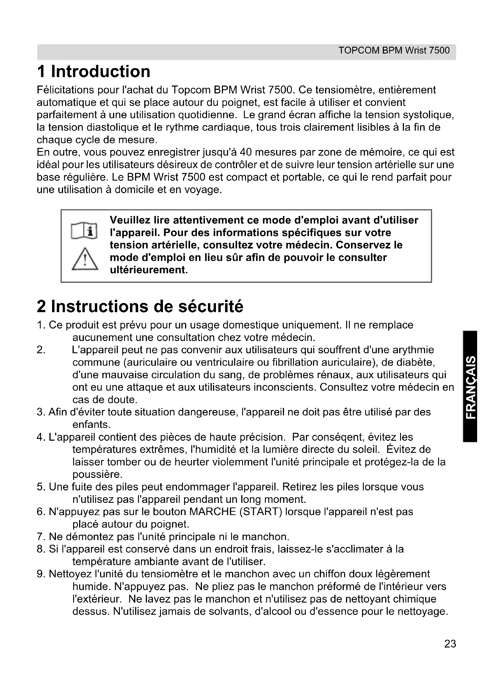 Schade of defecten te wijten aan onoordeelkundig gebruik of bediening en schade te wijten aan het gebruik van niet-originele onderdelen of accessoires worden niet gedekt door de garantie. De garantie dekt geen schade te wijten aan externe factoren, zoals bliksem, water en brand, noch enige transportschade. Er kan geen garantie worden ingeroepen als het serienummer op het toestel is gewijzigd, verwijderd of onleesbaar gemaakt. Garantieclaims zijn ongeldig indien het toestel hersteld, gewijzigd of aangepast werd door de koper. Het CE-symbool bevestigt dat het toestel voldoet aan de essentiële eisen van de richtlijn 93/42/EEG.23 TOPCOM BPM Wrist 7500 FRANÇAIS 1 Introduction Félicitations pour l'achat du Topcom BPM Wrist 7500. Ce tensiomètre, entièrement automatique et qui se place autour du poignet, est facile à utiliser et convient parfaitement à une utilisation quotidienne. Le grand écran affiche la tension systolique, la tension diastolique et le rythme cardiaque, tous trois clairement lisibles à la fin de chaque cycle de mesure. En outre, vous pouvez enregistrer jusqu'à 40 mesures par zone de mémoire, ce qui est idéal pour les utilisateurs désireux de contrôler et de suivre leur tension artérielle sur une base régulière. Le BPM Wrist 7500 est compact et portable, ce qui le rend parfait pour une utilisation à domicile et en voyage. 2 Instructions de sécurité