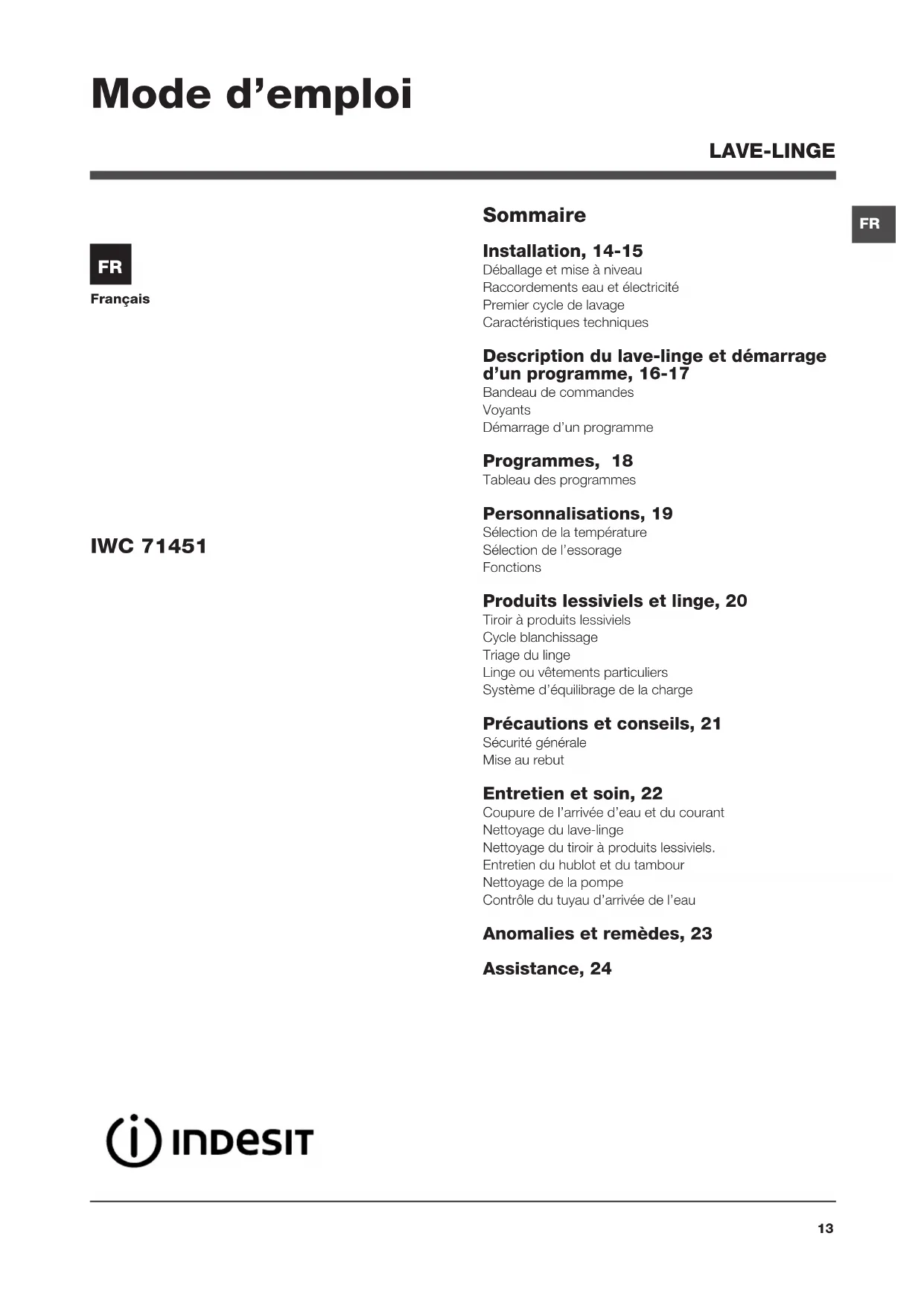 Retrouvez gratuitement la notice de l'appareil IWC 71451 ECO EU INDESIT au format PDF.