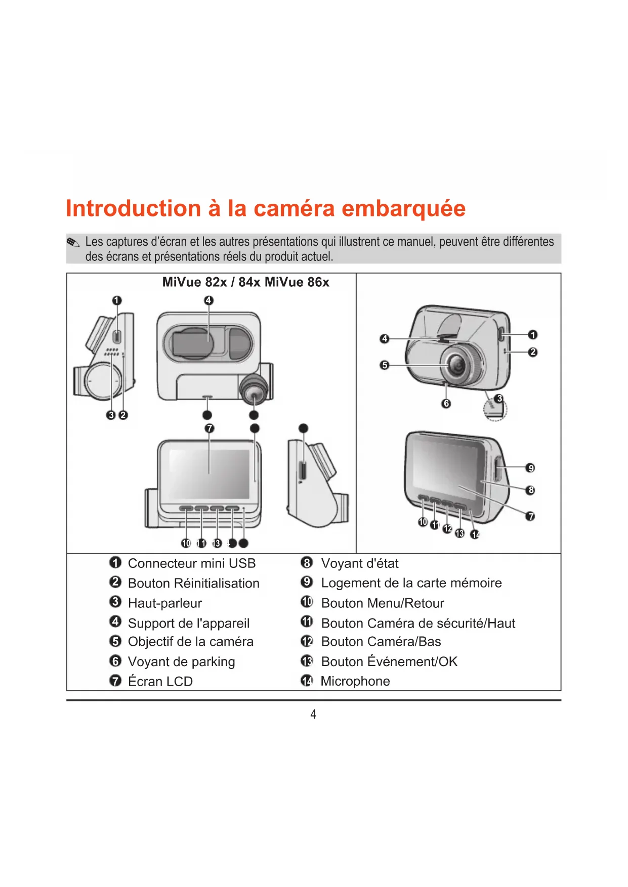 Les captures d’écran et les autres présentations qui illustrent ce manuel, peuvent être différentes des écrans et présentations réels du produit actuel. MiVue 82x / 84x MiVue 86x