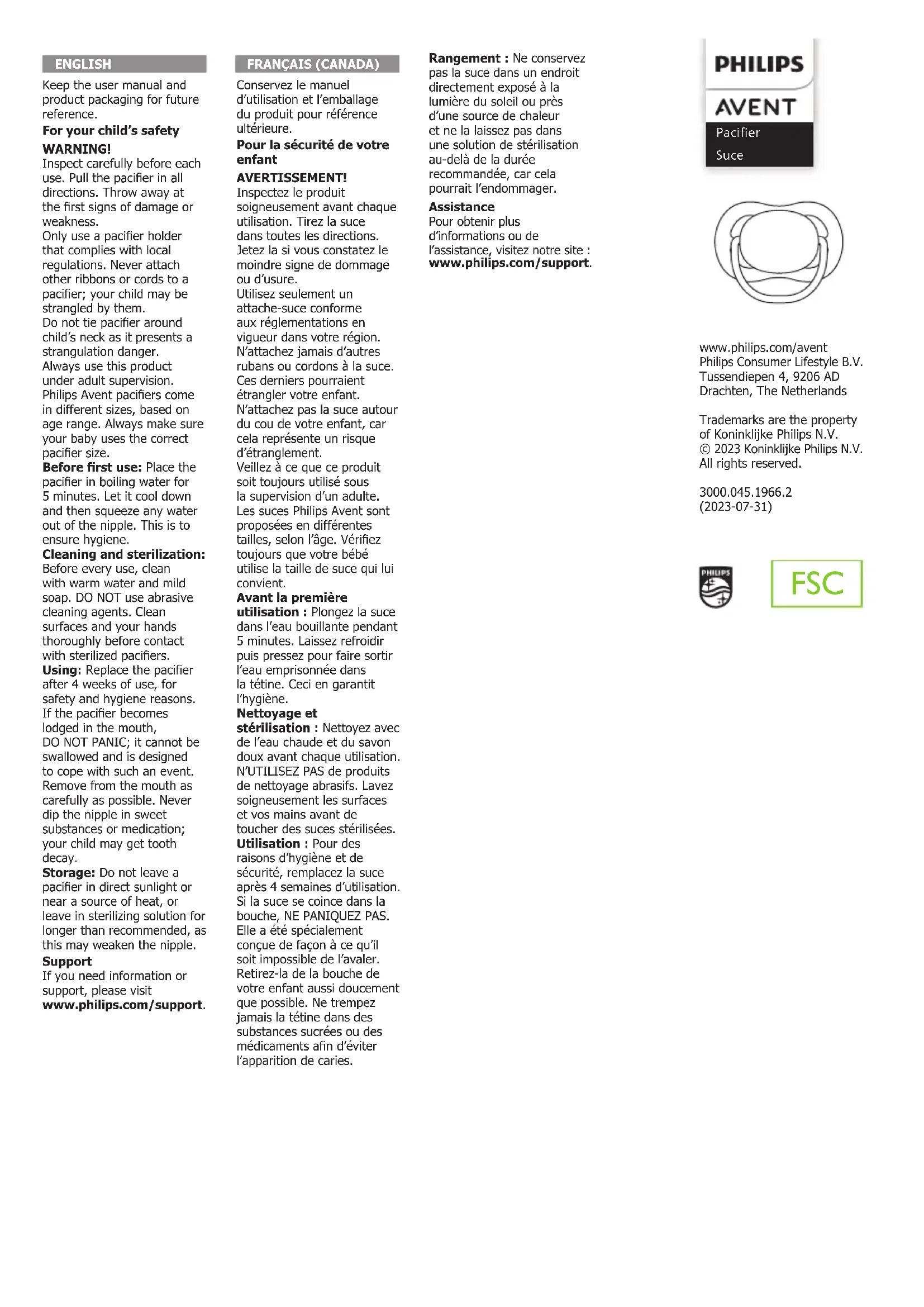 (2023-07-31) FSC ENGLISH Keep the user manual and product packaging for future reference. For your child’s safety WARNING! Inspect carefully before each use. Pull the pacier in all directions. Throw away at the rst signs of damage or weakness. Only use a pacier holder that complies with local regulations. Never attach other ribbons or cords to a pacier; your child may be strangled by them. Do not tie pacier around child’s neck as it presents a strangulation danger. Always use this product under adult supervision. Philips Avent paciers come in different sizes, based on age range. Always make sure your baby uses the correct pacier size. Before rst use: Place the pacier in boiling water for 5 minutes. Let it cool down and then squeeze any water out of the nipple. This is to ensure hygiene. Cleaning and sterilization: Before every use, clean with warm water and mild soap. DO NOT use abrasive cleaning agents. Clean surfaces and your hands thoroughly before contact with sterilized paciers. Using: Replace the pacier after 4 weeks of use, for safety and hygiene reasons. If the pacier becomes lodged in the mouth, DO NOT PANIC; it cannot be swallowed and is designed to cope with such an event. Remove from the mouth as carefully as possible. Never dip the nipple in sweet substances or medication; your child may get tooth decay. Storage: Do not leave a pacier in direct sunlight or near a source of heat, or leave in sterilizing solution for longer than recommended, as this may weaken the nipple. Support If you need information or support, please visit www.philips.com/support. FRANÇAIS (CANADA) Conservez le manuel d’utilisation et l’emballage du produit pour référence ultérieure. Pour la sécurité de votre enfant AVERTISSEMENT! Inspectez le produit soigneusement avant chaque utilisation. Tirez la suce dans toutes les directions. Jetez la si vous constatez le moindre signe de dommage ou d’usure. Utilisez seulement un attache-suce conforme aux réglementations en vigueur dans votre région. N’attachez jamais d’autres rubans ou cordons à la suce. Ces derniers pourraient étrangler votre enfant. N’attachez pas la suce autour du cou de votre enfant, car cela représente un risque d’étranglement. Veillez à ce que ce produit soit toujours utilisé sous la supervision d’un adulte. Les suces Philips Avent sont proposées en différentes tailles, selon l’âge. Vériez toujours que votre bébé utilise la taille de suce qui lui convient. Avant la première utilisation : Plongez la suce dans l’eau bouillante pendant 5 minutes. Laissez refroidir puis pressez pour faire sortir l’eau emprisonnée dans la tétine. Ceci en garantit l’hygiène. Nettoyage et stérilisation : Nettoyez avec de l’eau chaude et du savon doux avant chaque utilisation. N’UTILISEZ PAS de produits de nettoyage abrasifs. Lavez soigneusement les surfaces et vos mains avant de toucher des suces stérilisées. Utilisation : Pour des raisons d’hygiène et de sécurité, remplacez la suce après 4 semaines d’utilisation. Si la suce se coince dans la bouche, NE PANIQUEZ PAS. Elle a été spécialement conçue de façon à ce qu’il soit impossible de l’avaler. Retirez-la de la bouche de votre enfant aussi doucement que possible. Ne trempez jamais la tétine dans des substances sucrées ou des médicaments an d’éviter l’apparition de caries. Rangement : Ne conservez pas la suce dans un endroit directement exposé à la lumière du soleil ou près d’une source de chaleur et ne la laissez pas dans une solution de stérilisation au-delà de la durée recommandée, car cela pourrait l’endommager. Assistance Pour obtenir plus d’informations ou de l’assistance, visitez notre site : www.philips.com/support. Pacier Suce