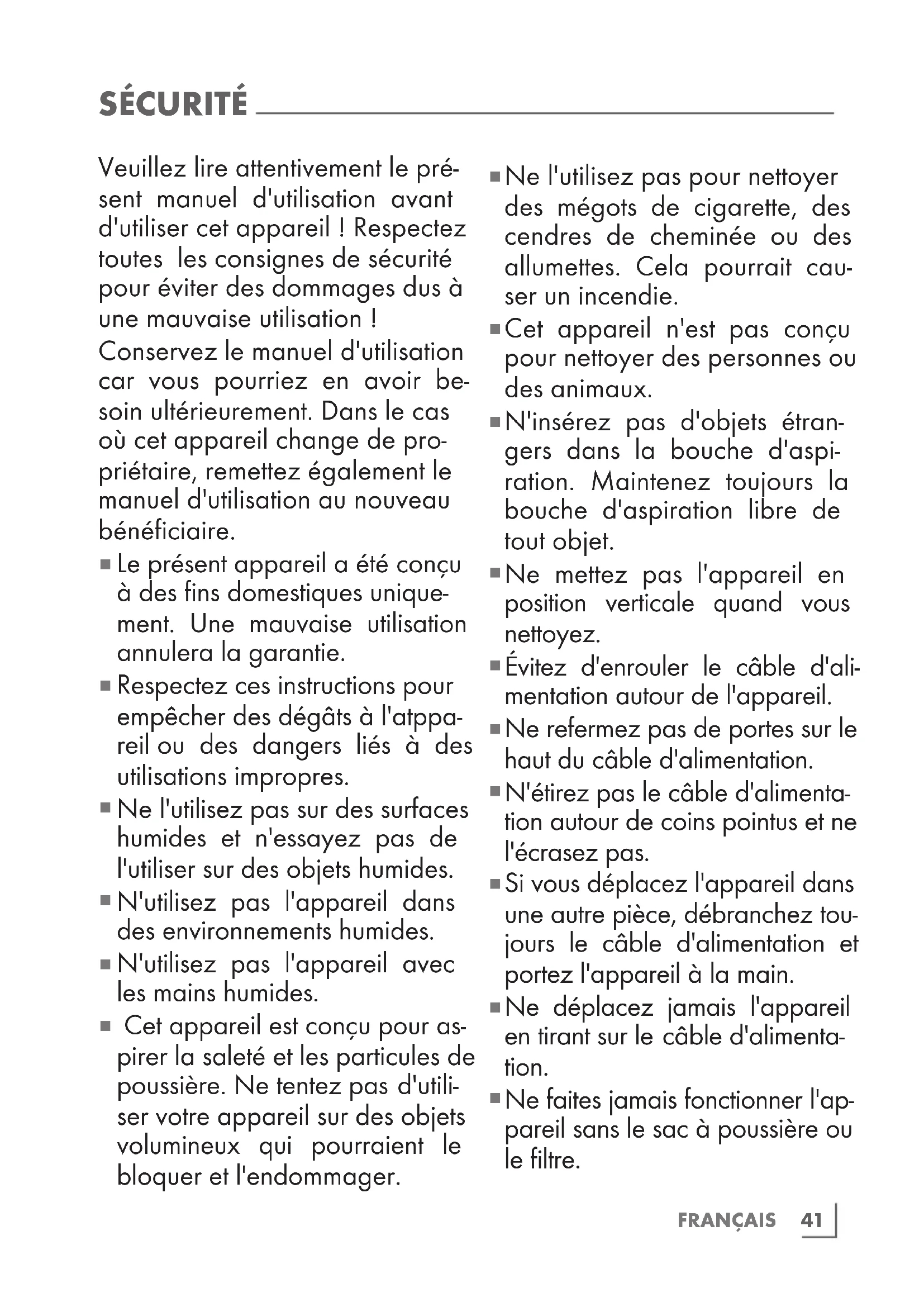 Cet appeareil n'est pas concu pour nettoyer des personnes ou des animaux.