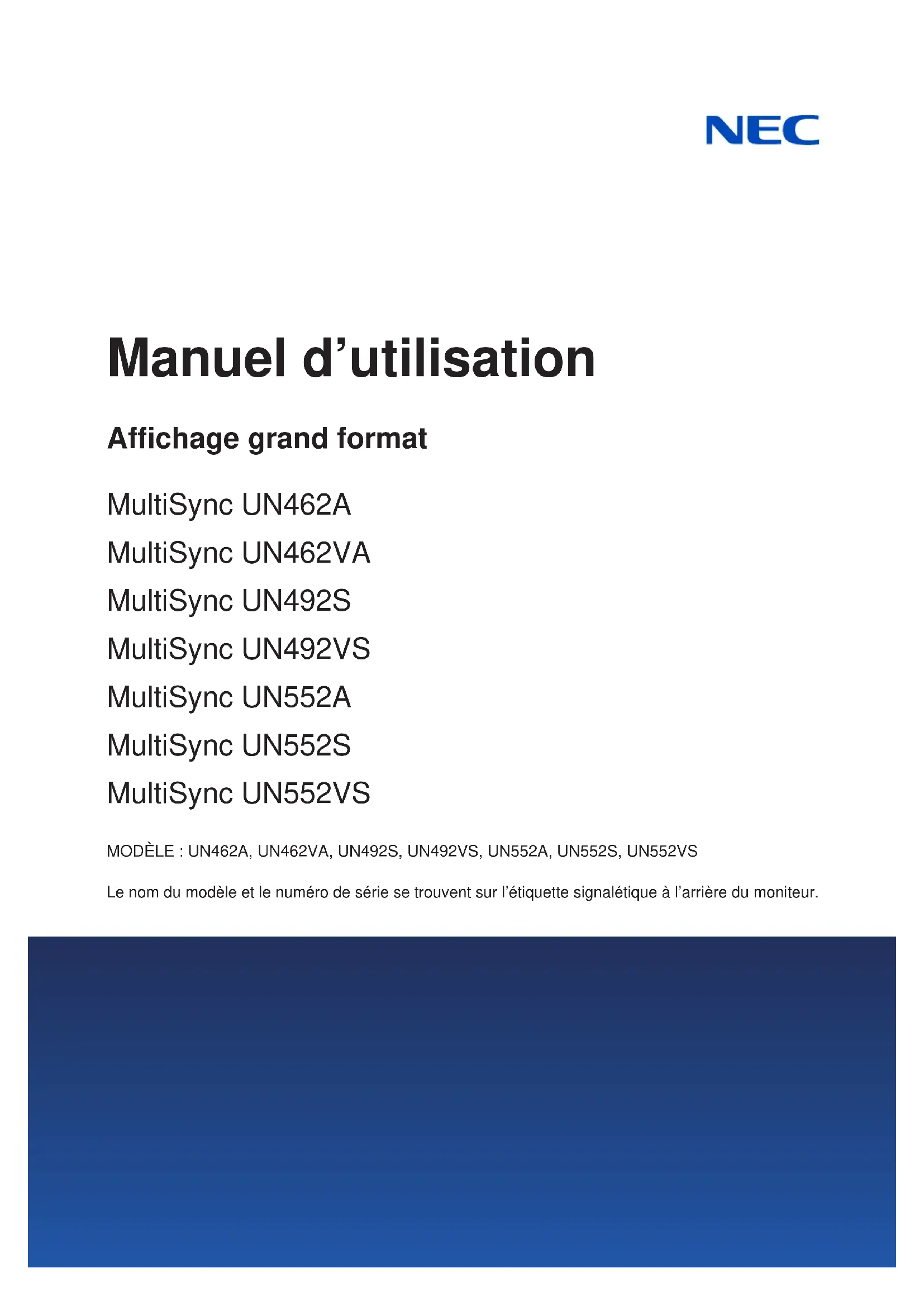 - Manuel d’utilisation Affichage grand format MultiSync UN462A MultiSync UN462VA MultiSync UN492S MultiSync UN492VS MultiSync UN552A MultiSync UN552S MultiSync UN552VS MODÈLE : UN462A, UN462VA, UN492S, UN492VS, UN552A, UN552S, UN552VS Le nom du modèle et le numéro de série se trouvent sur l’étiquette signalétique à l’arrière du moniteur.Sommaire Informations sur l’enregistrement p. 1